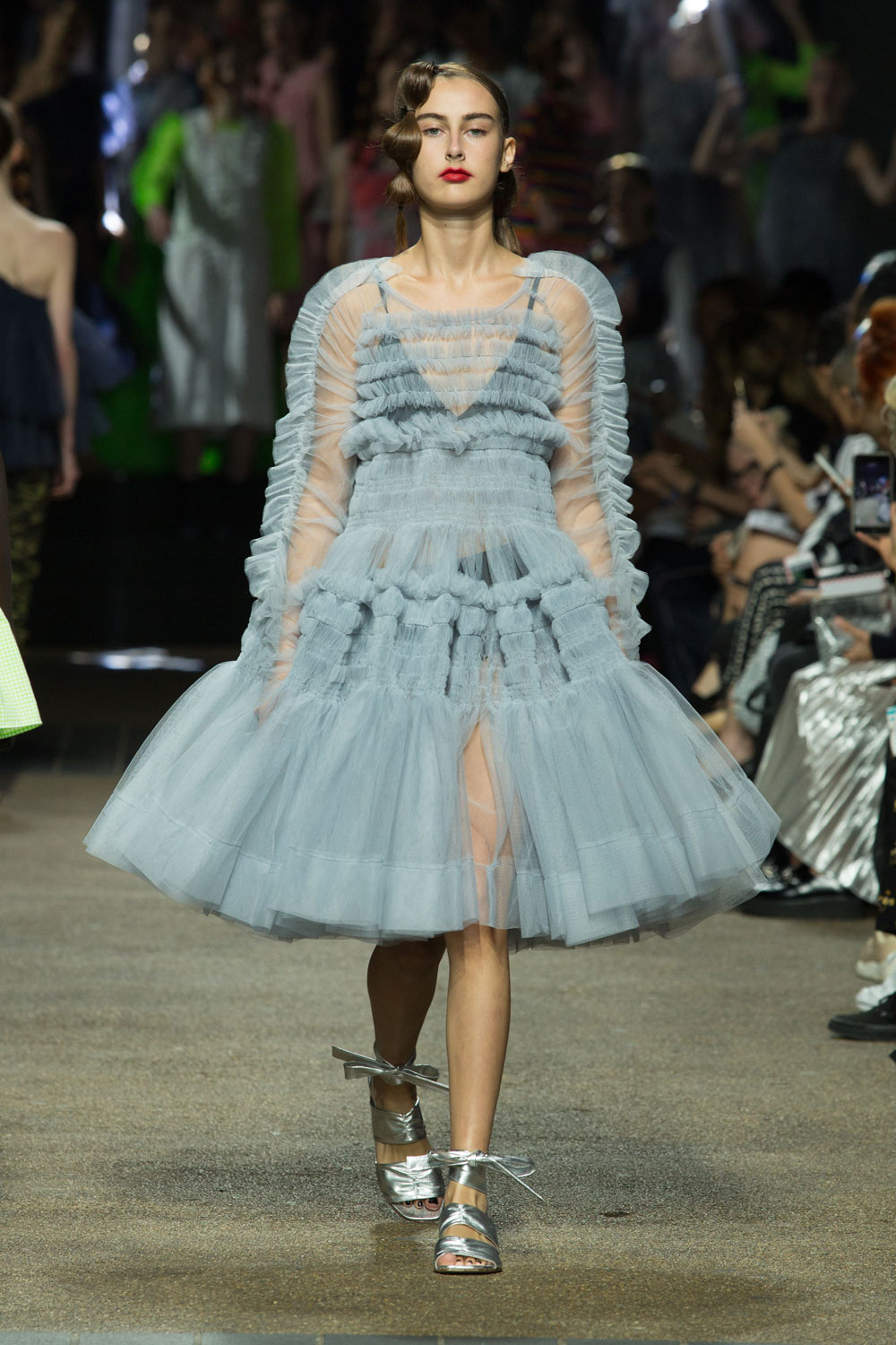 如果说上一季的暗黑风格还不算惊人,这次的电音效果应该能让人为之一振。模特走回出发点后便开始站成几排“群魔乱舞”,有些舞蹈功底的会在牌子上来个顿点,当然大部分模特不过半眯双眼随意摆动而已。整场模特谢幕前的最后一段音乐是改编版本的《我心依旧》,杰克和露丝恐怕做梦也想不到自己的悲情旋律会变得如此酷炫。至于时装本身倒没有太大亮点,褶皱加蓬裙,只是提醒我们Molly Goddard是谁而已。