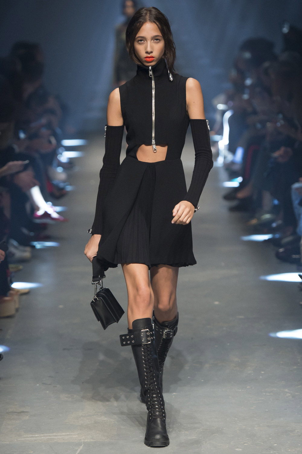 沿袭品牌一贯的性感美学,皮衣、露肩连身裙、露腰上衣、及膝长靴、超大版机车夹克......等轮番亮相。衣服细节部位的拉链起到了点睛作用。设计团队就连随性的丹宁面料也没被放过,刻意作出磨损效果后,他们还在底部加了一层水晶,让衣服随着模特走动泛出光泽。为平衡飒爽风姿,Versace在几款短裙两侧加入褶皱设计,软化整体英气程度。