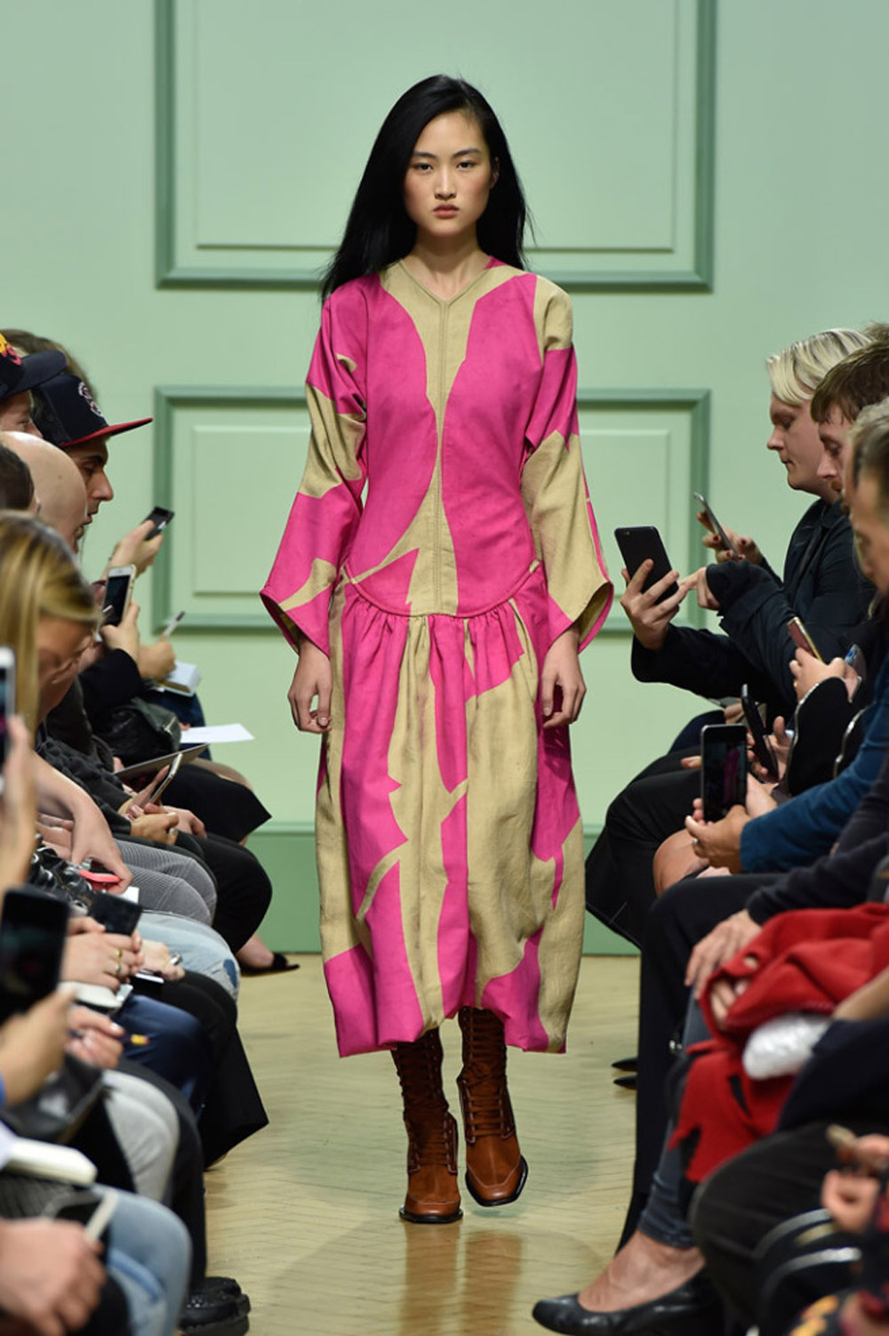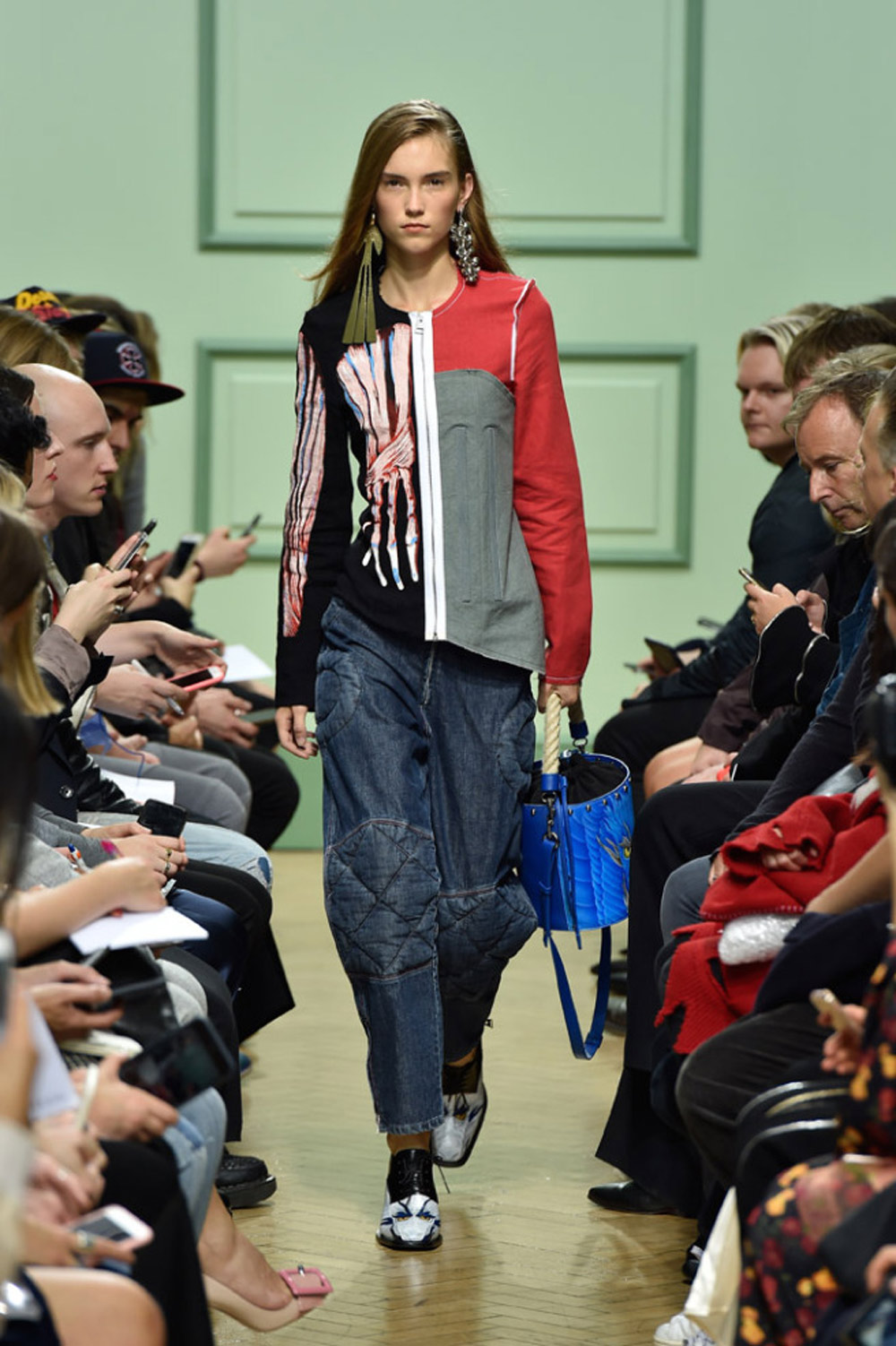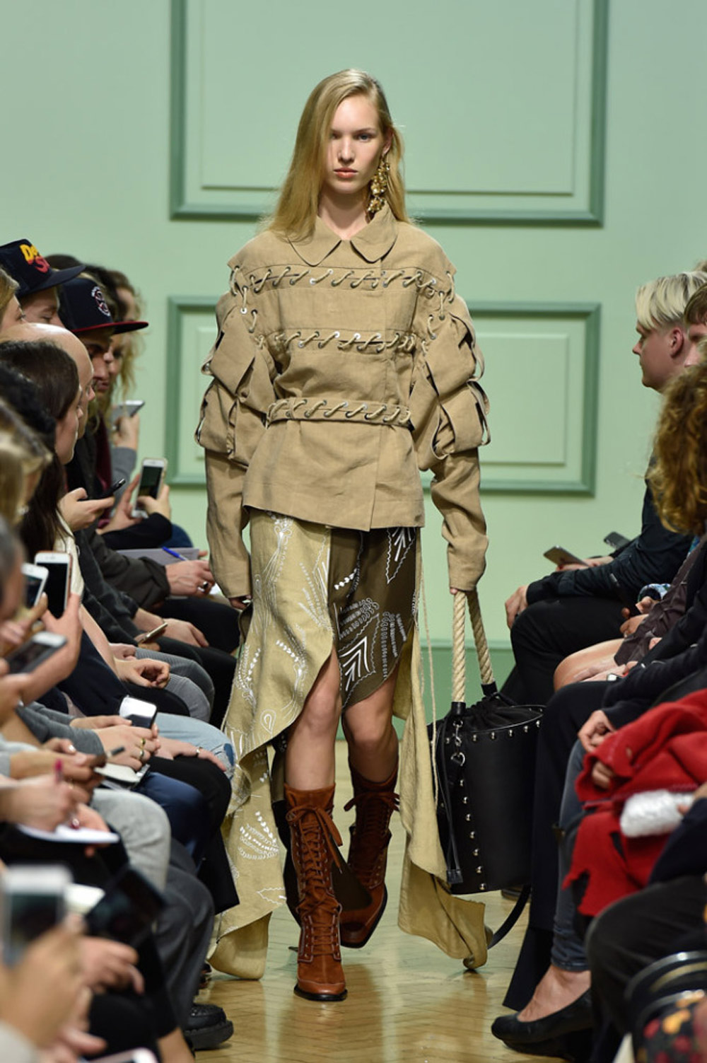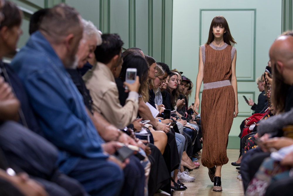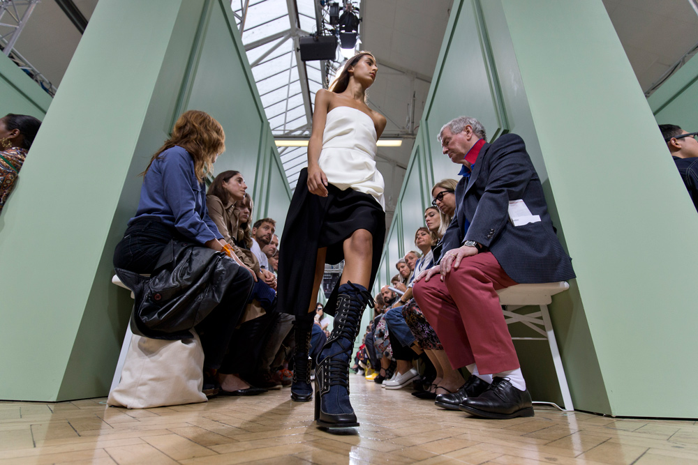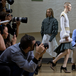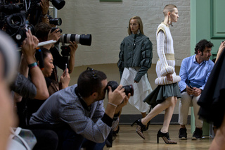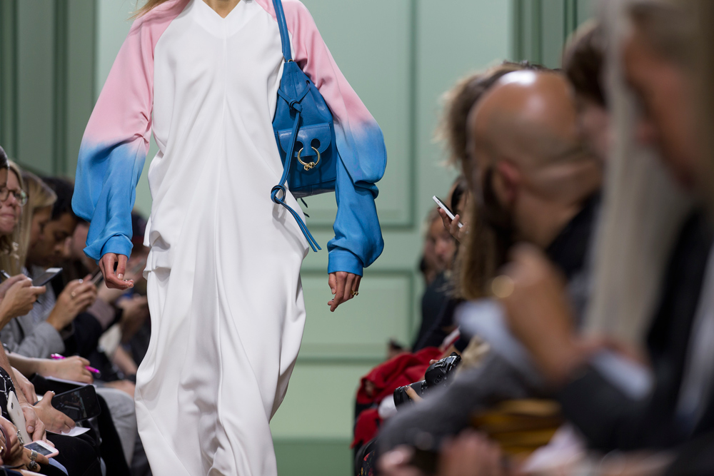 坐得近意味着无法伸展奔波一天的双腿,但好处在于能看清细节。“假如500名来宾用手机拍出500个细节,上传至Instagram和Facebook后就会拼出完整造型。”创意总监J.W.Anderson解释说,“我不认为大家应该和模特一样穿全身造型,这看来会像是戏服。”