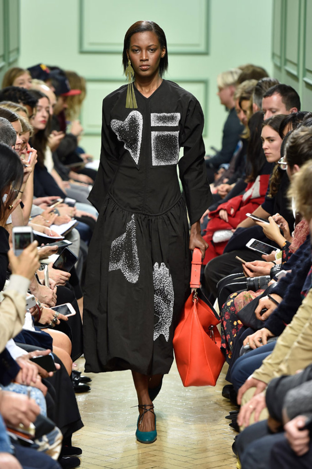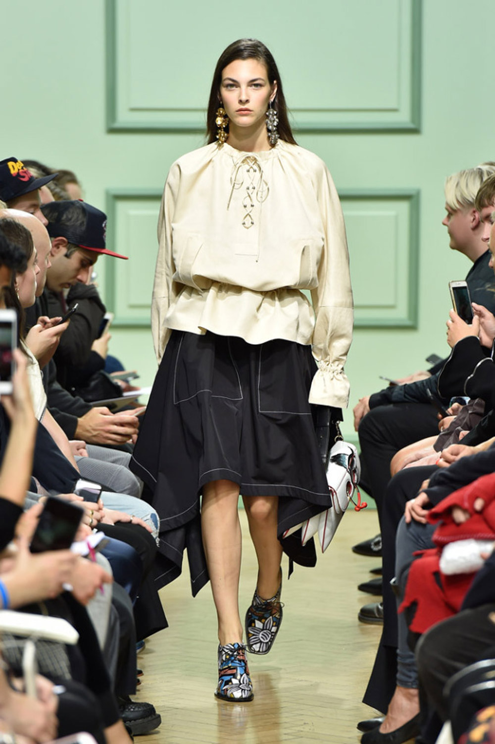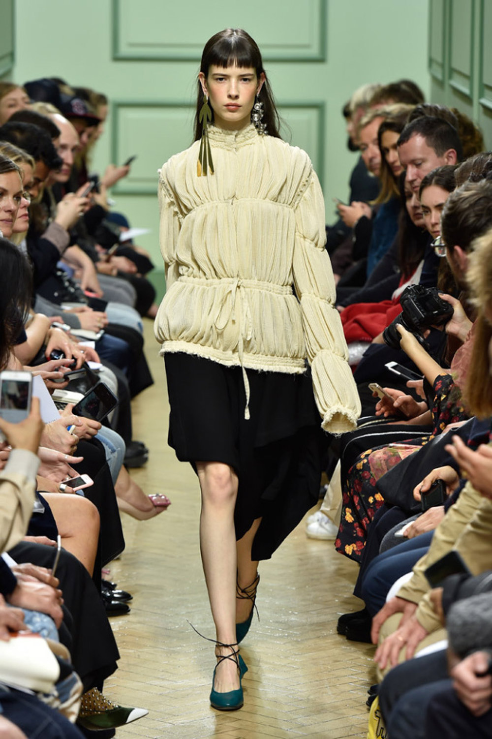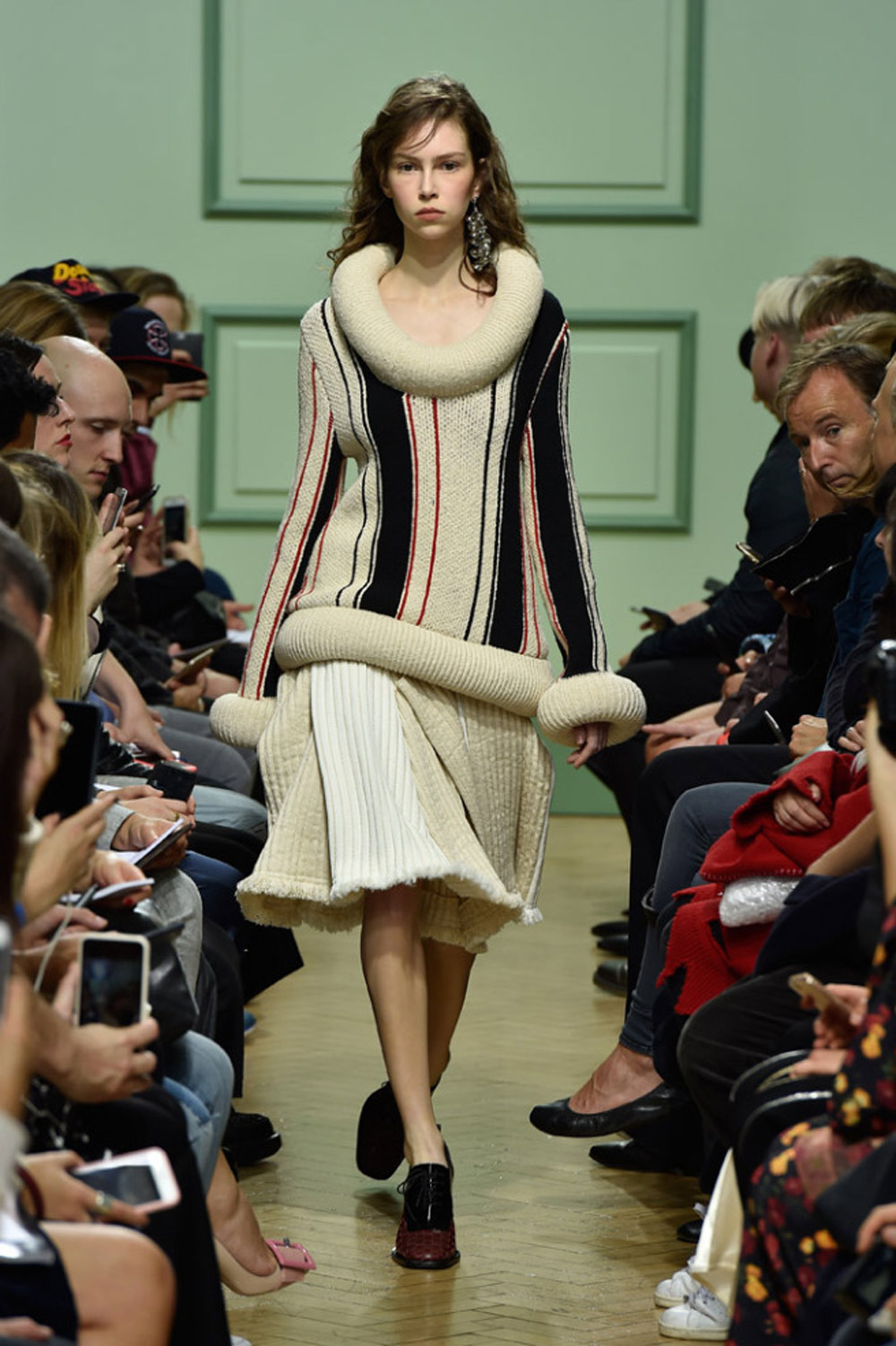 坐得近意味着无法伸展奔波一天的双腿,但好处在于能看清细节。“假如500名来宾用手机拍出500个细节,上传至Instagram和Facebook后就会拼出完整造型。”创意总监J.W.Anderson解释说,“我不认为大家应该和模特一样穿全身造型,这看来会像是戏服。”