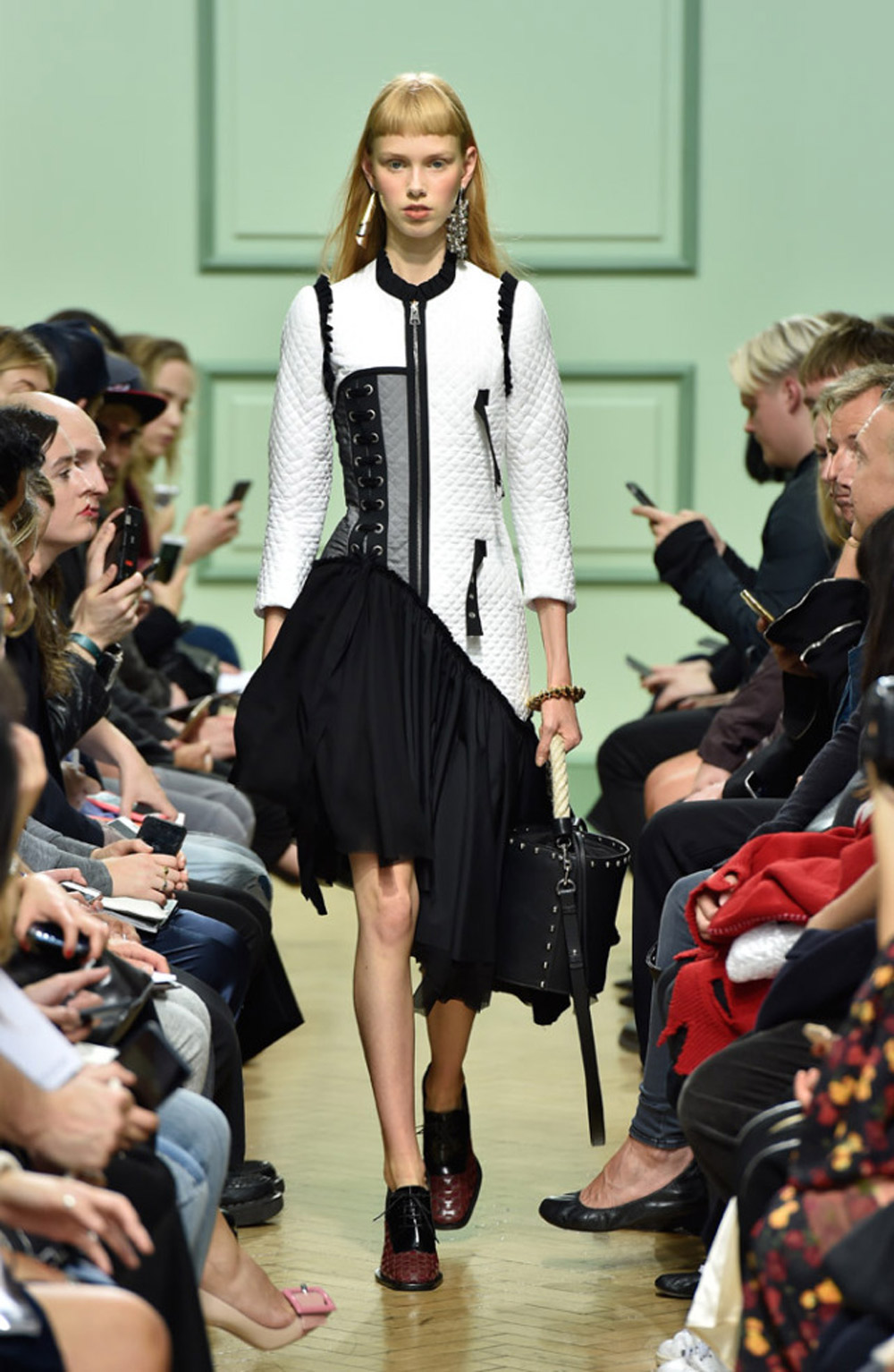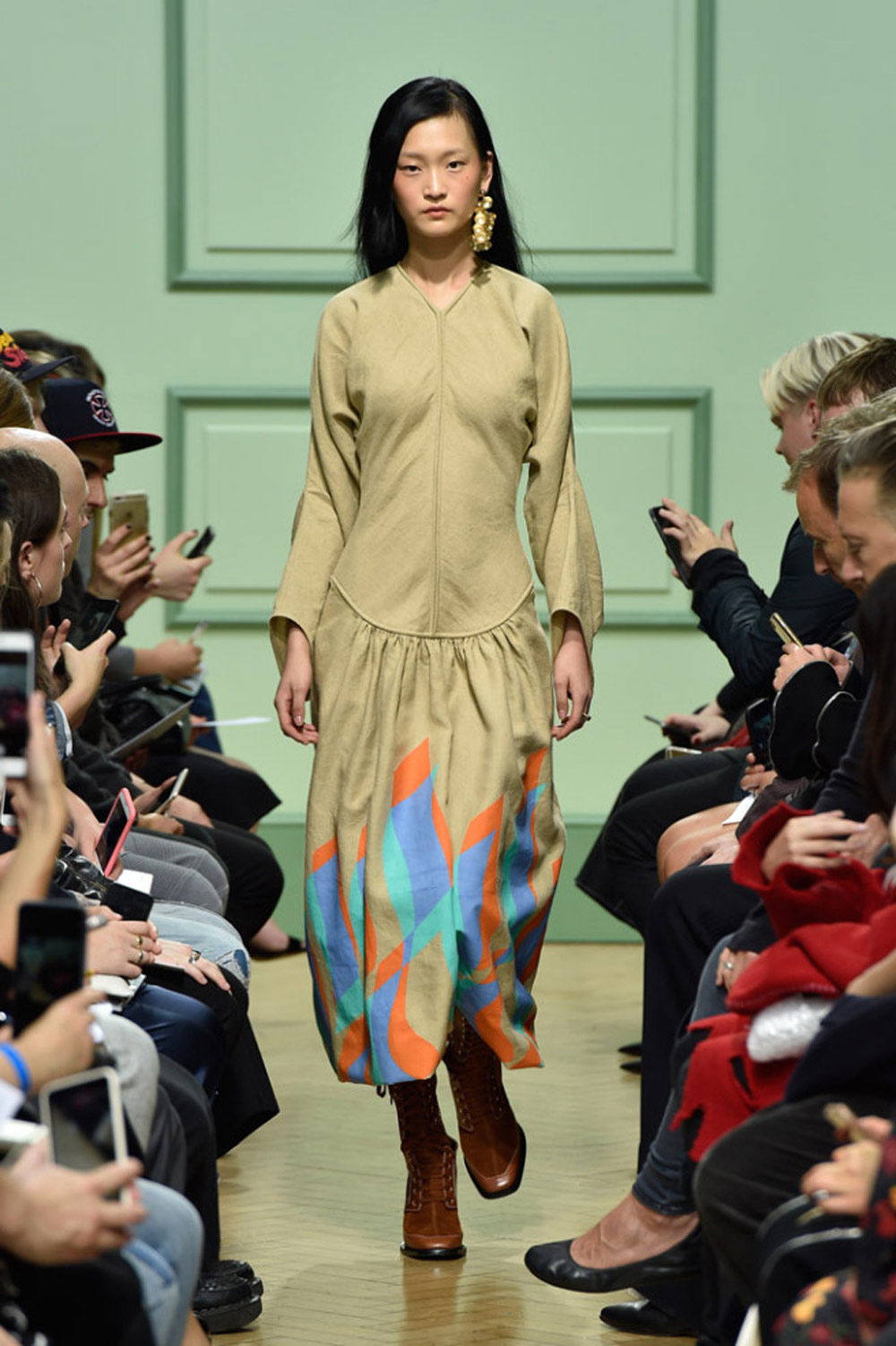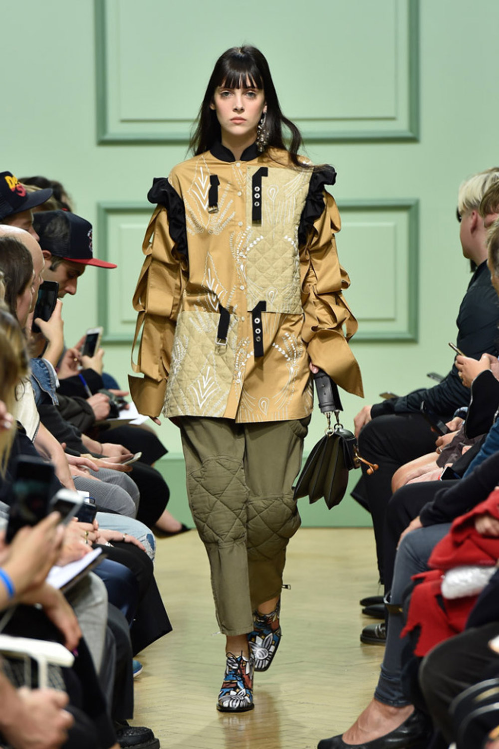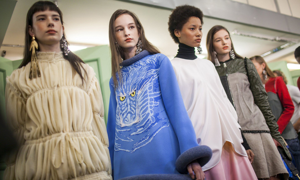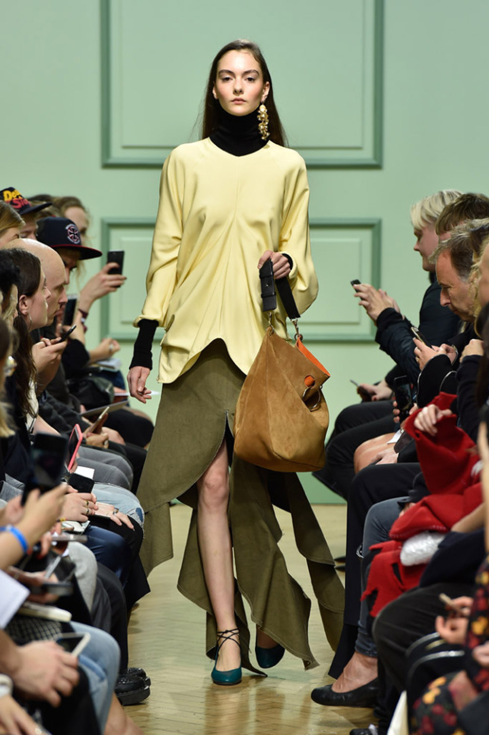 坐得近意味着无法伸展奔波一天的双腿,但好处在于能看清细节。“假如500名来宾用手机拍出500个细节,上传至Instagram和Facebook后就会拼出完整造型。”创意总监J.W.Anderson解释说,“我不认为大家应该和模特一样穿全身造型,这看来会像是戏服。”