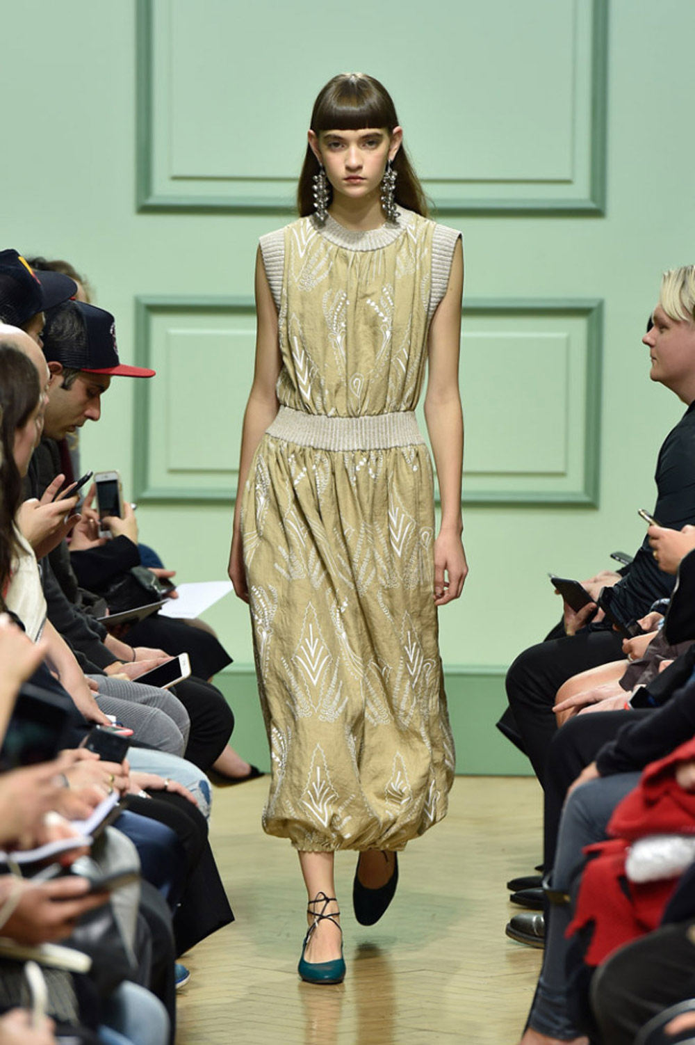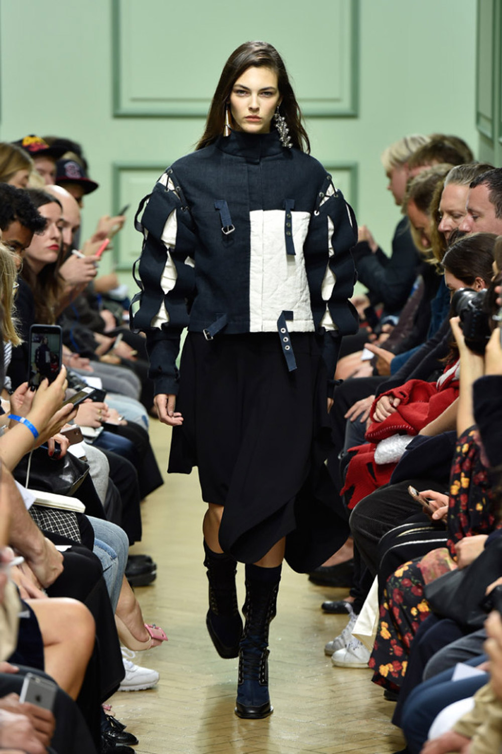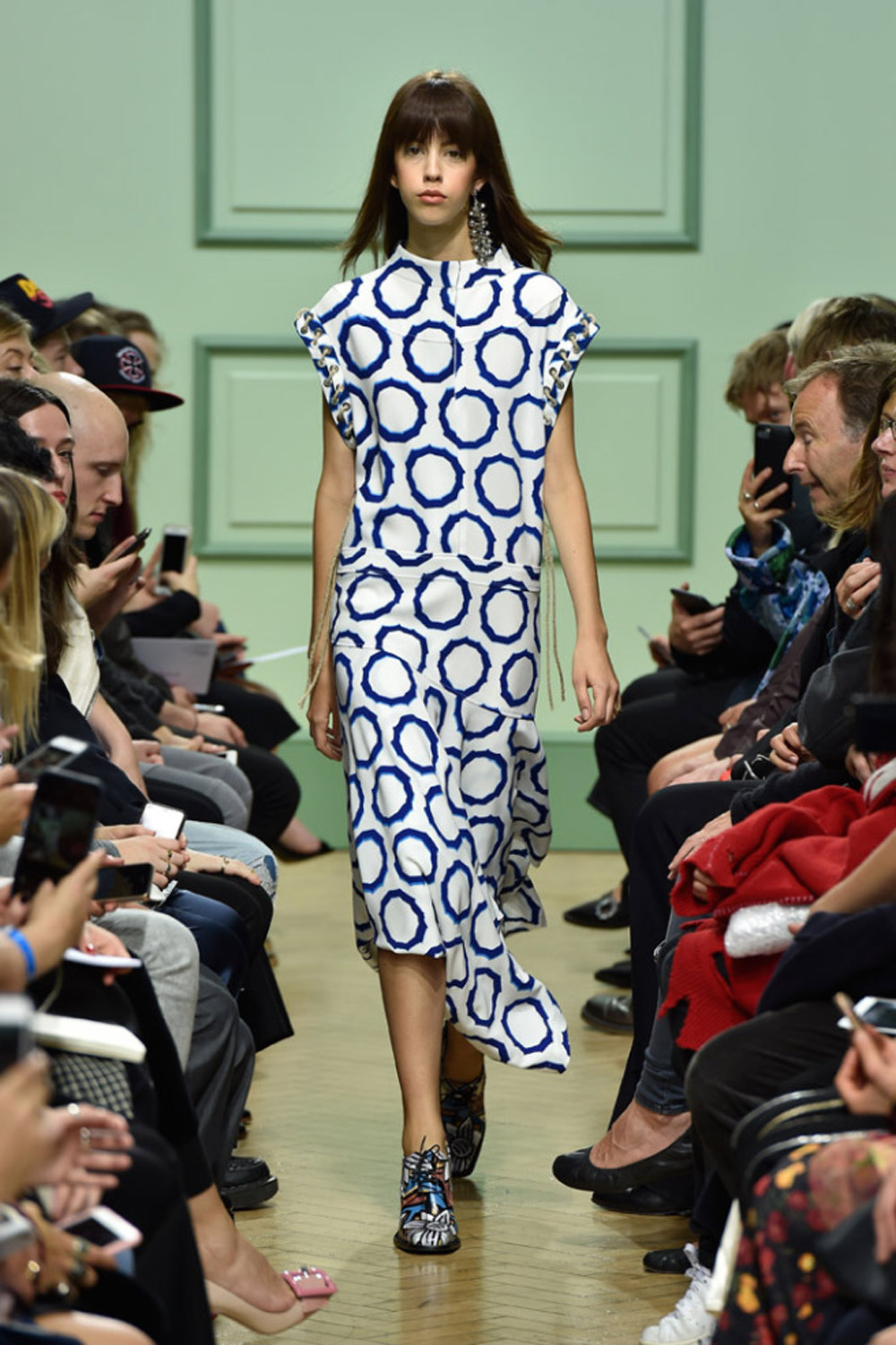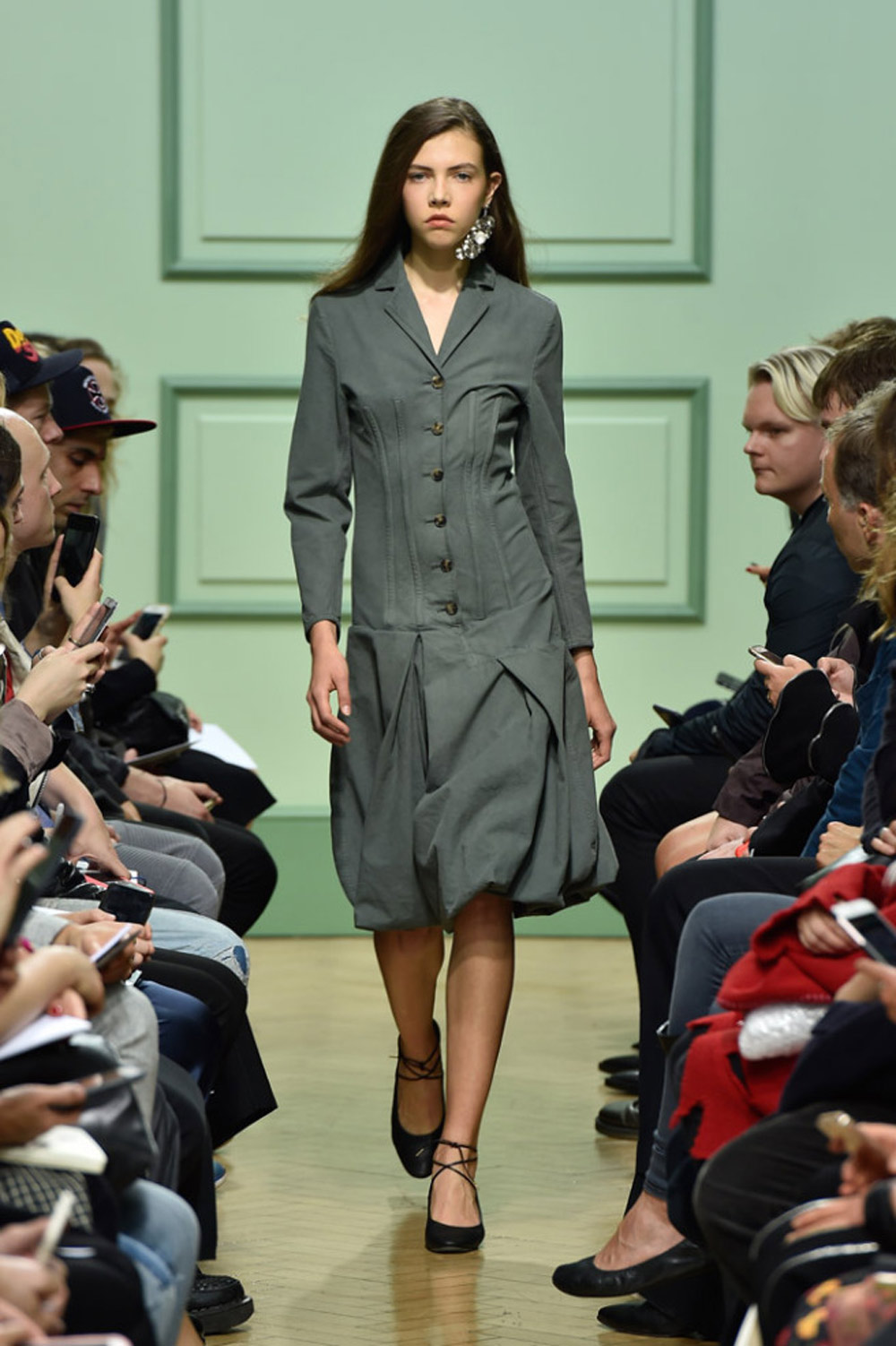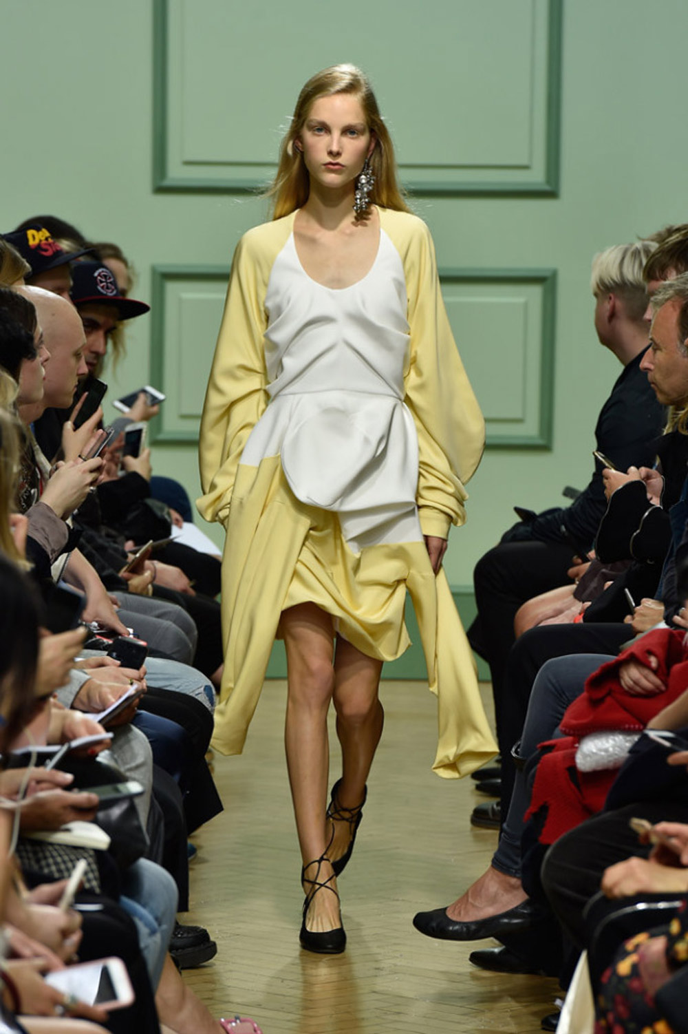 坐得近意味着无法伸展奔波一天的双腿,但好处在于能看清细节。“假如500名来宾用手机拍出500个细节,上传至Instagram和Facebook后就会拼出完整造型。”创意总监J.W.Anderson解释说,“我不认为大家应该和模特一样穿全身造型,这看来会像是戏服。”