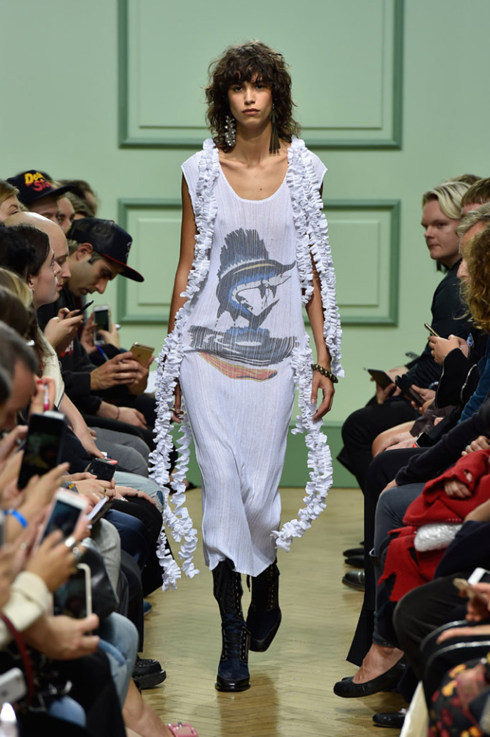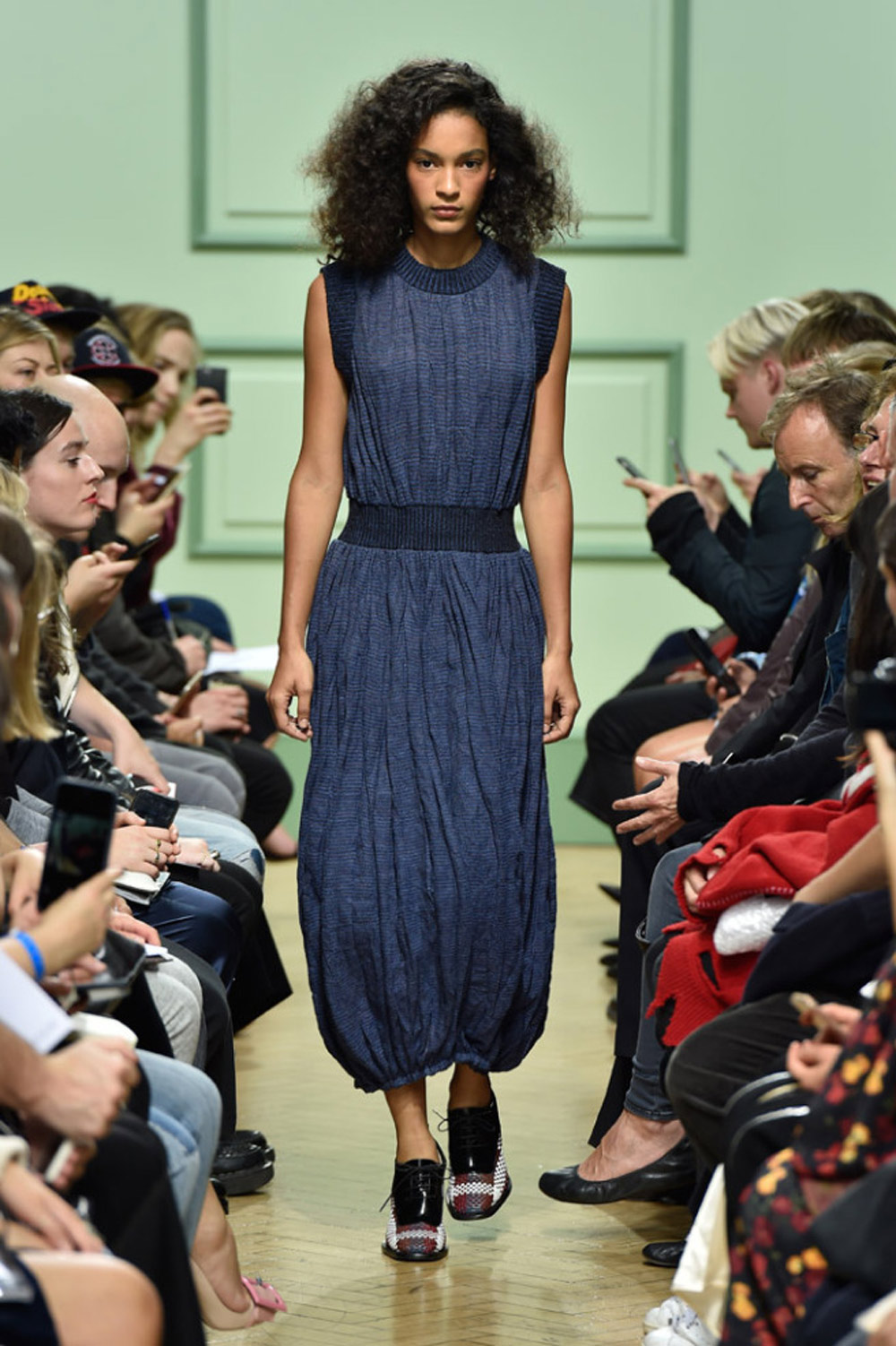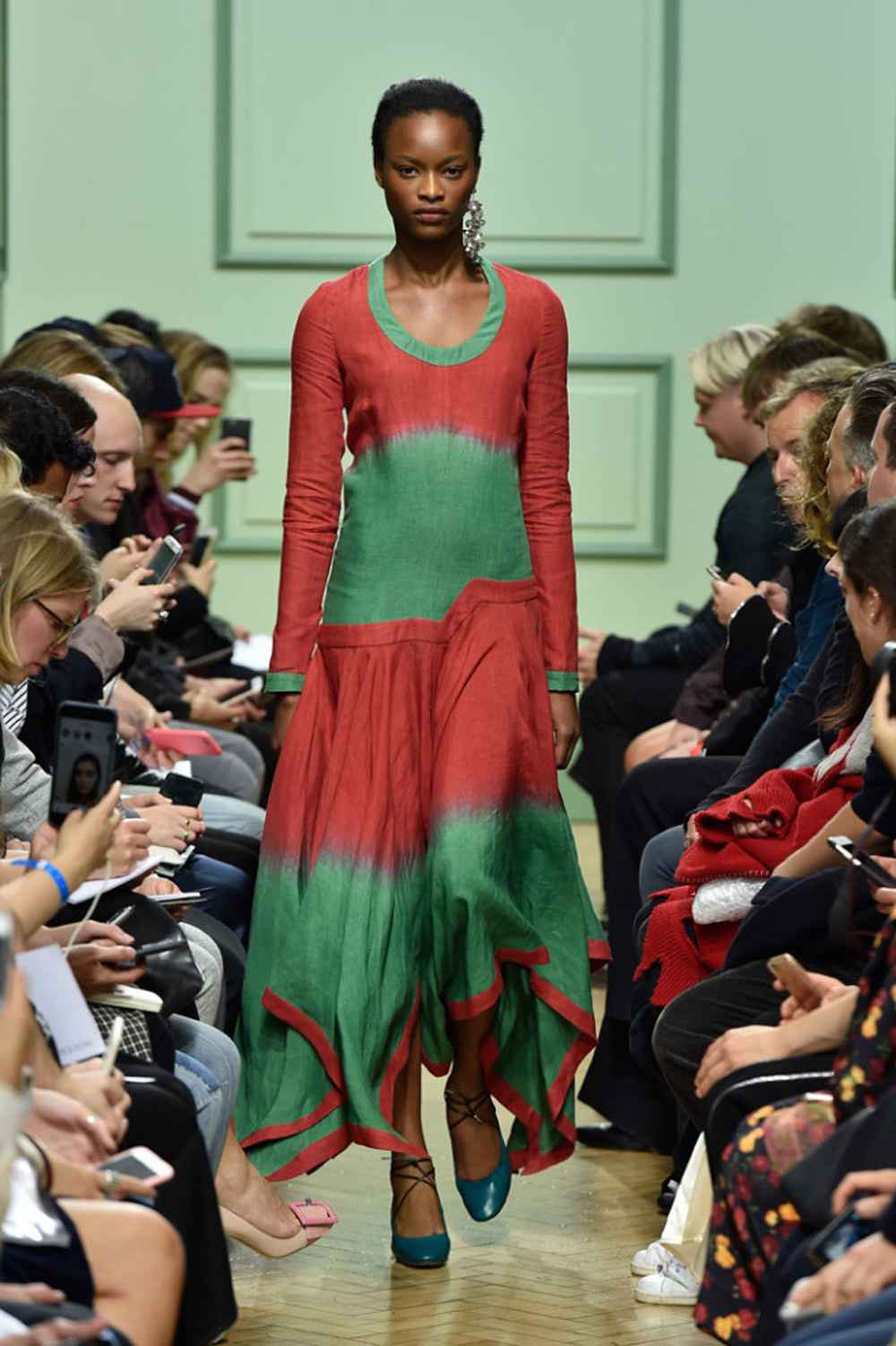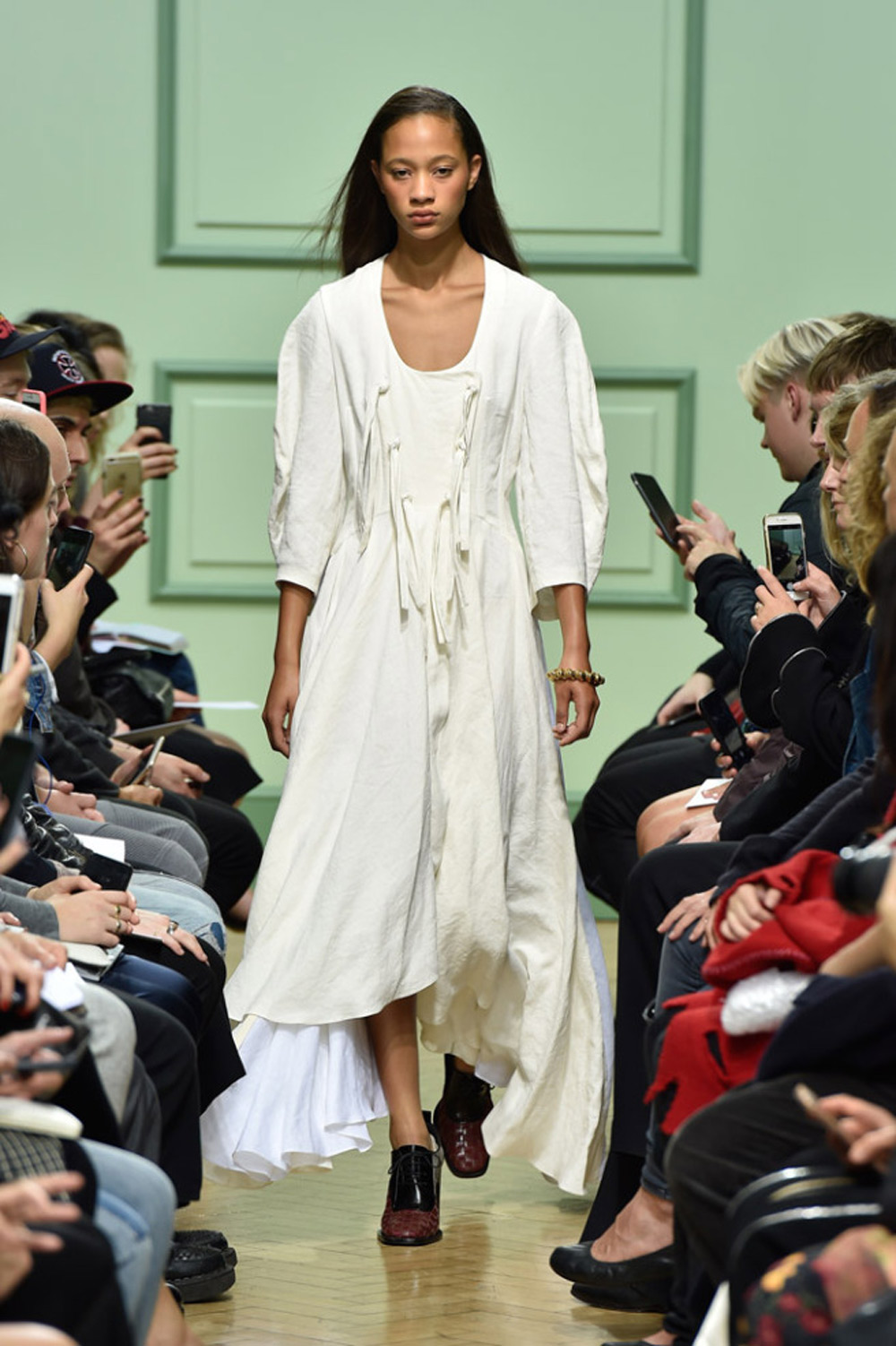 坐得近意味着无法伸展奔波一天的双腿,但好处在于能看清细节。“假如500名来宾用手机拍出500个细节,上传至Instagram和Facebook后就会拼出完整造型。”创意总监J.W.Anderson解释说,“我不认为大家应该和模特一样穿全身造型,这看来会像是戏服。”