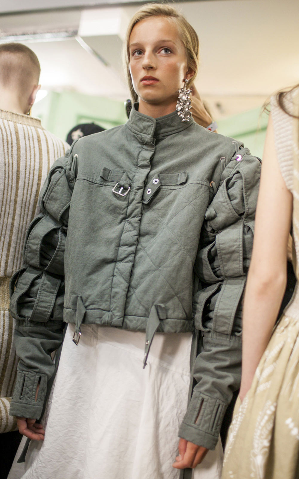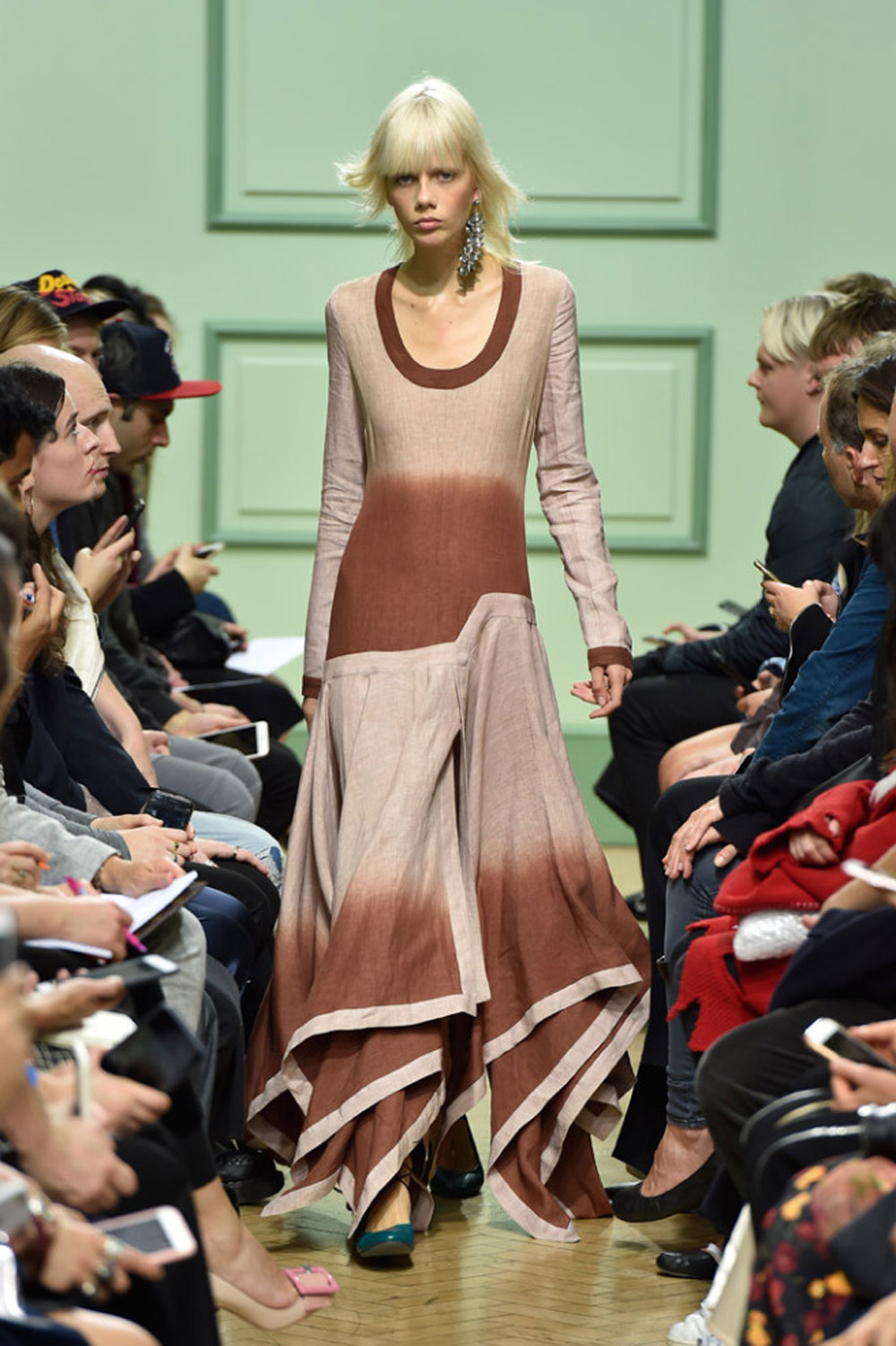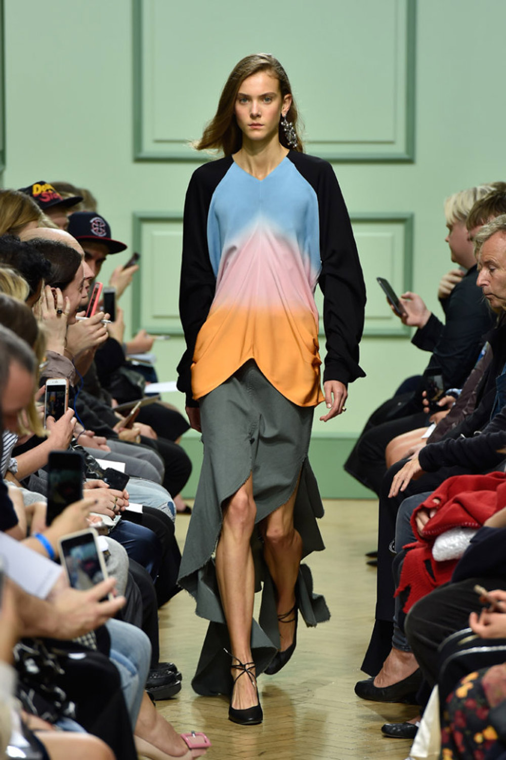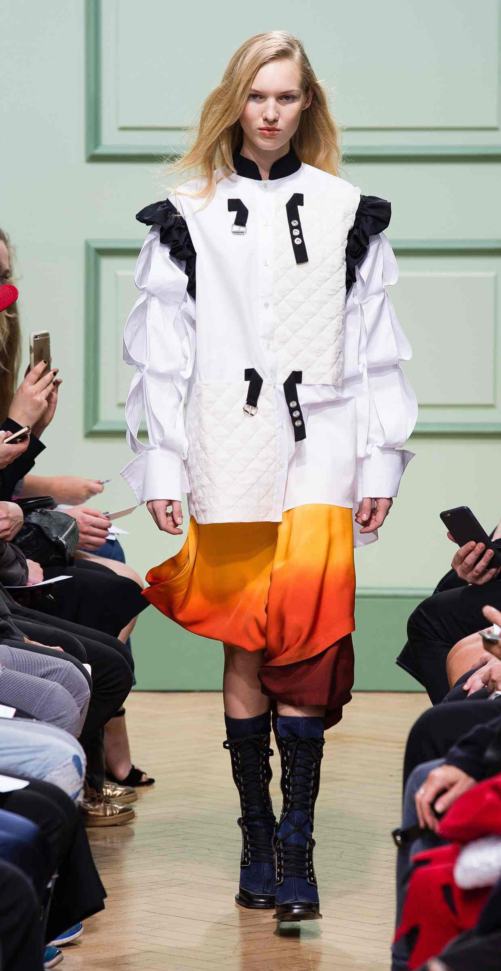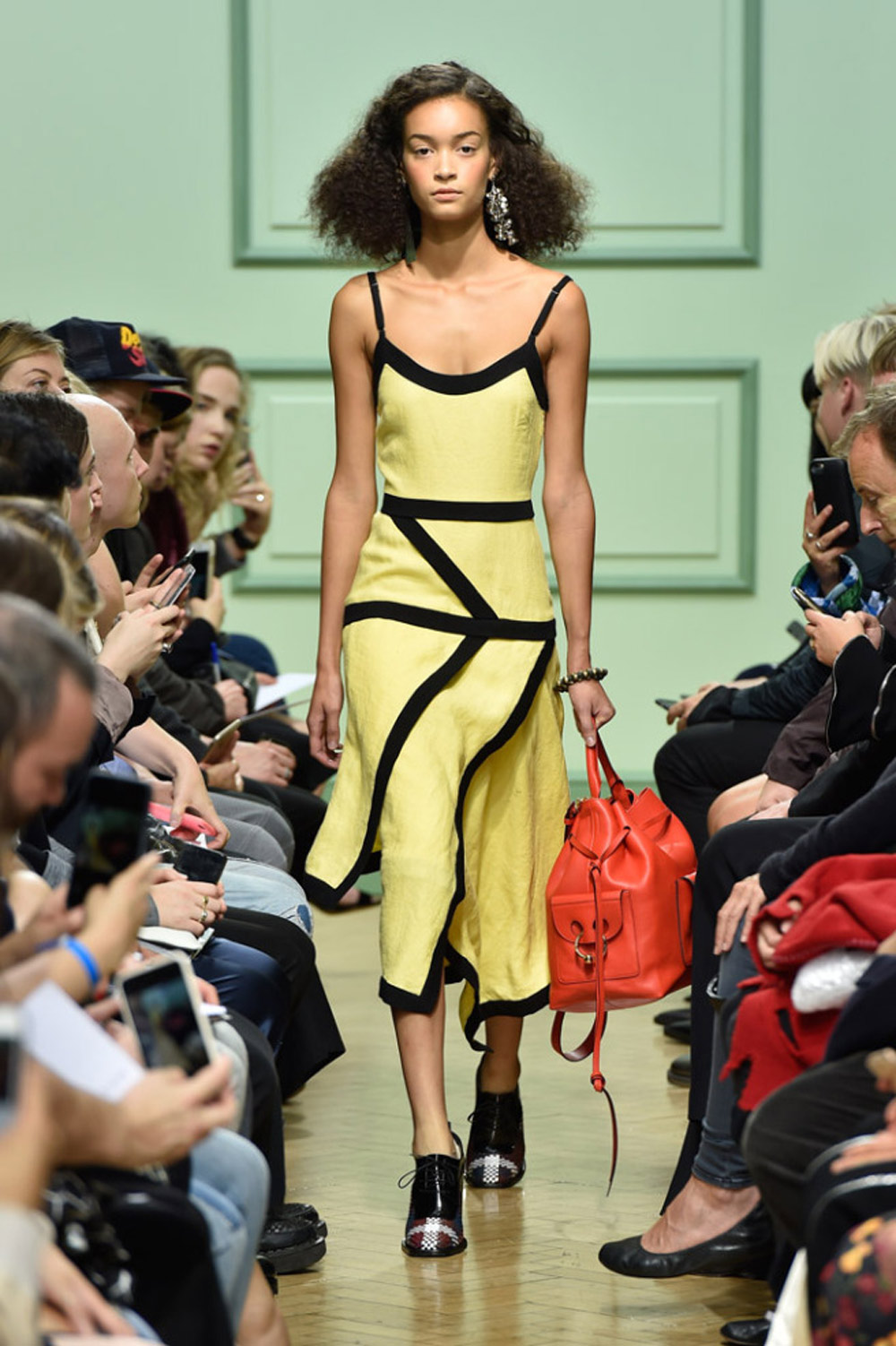 坐得近意味着无法伸展奔波一天的双腿,但好处在于能看清细节。“假如500名来宾用手机拍出500个细节,上传至Instagram和Facebook后就会拼出完整造型。”创意总监J.W.Anderson解释说,“我不认为大家应该和模特一样穿全身造型,这看来会像是戏服。”