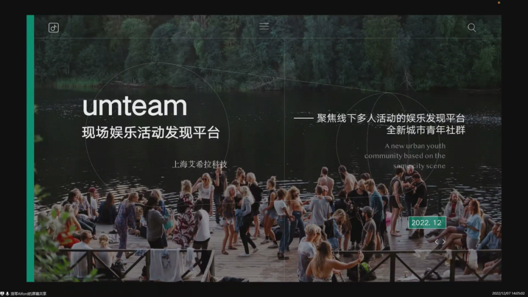 开场介绍过后,第一个路演项目即Umteams——现场娱乐活动发现平台。项目针对一线及新一线城市文娱消费需求大、信息获取较难等情况,开发基于同城活动和社交的线上平台,精准、定制化推荐活动与社群,并搭配自营活动等深度运营。目前,项目在上海试运营3个季度,挂出8000+场活动并建立了3000+群组。