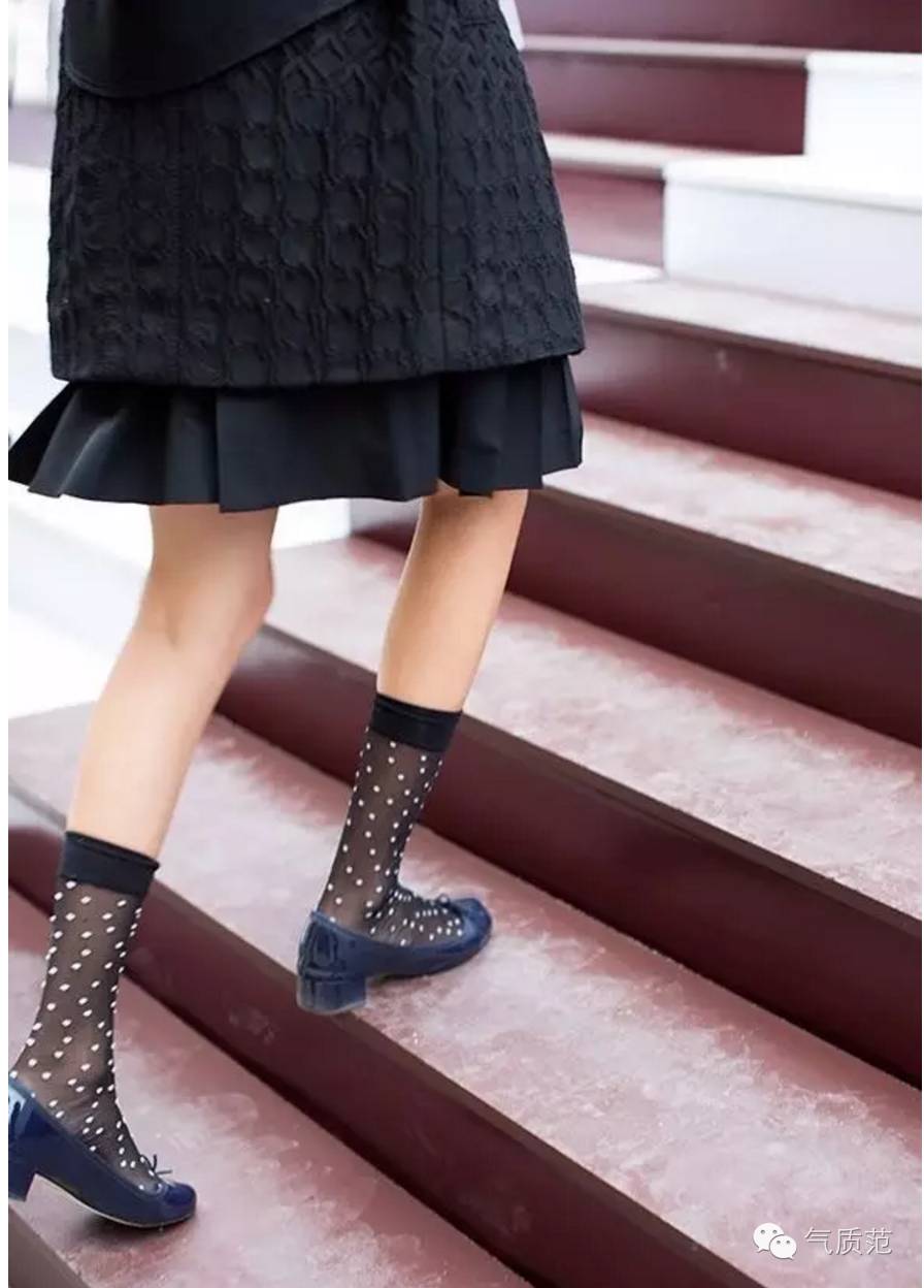 这种美腻的袜子的正确穿法是把它拉到小腿肚上,配上平底芭蕾鞋最唯美,不过前提是你的双腿够骨感哦!