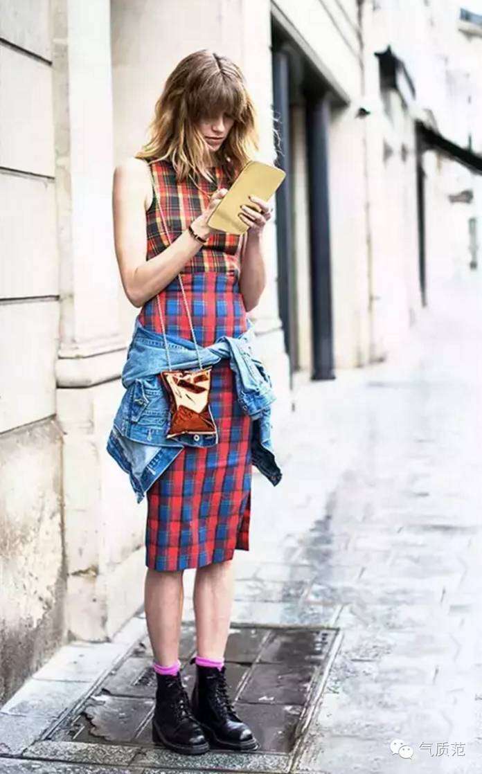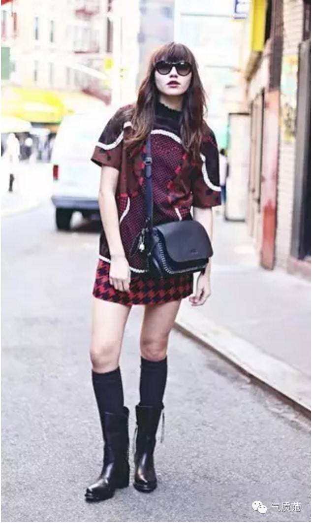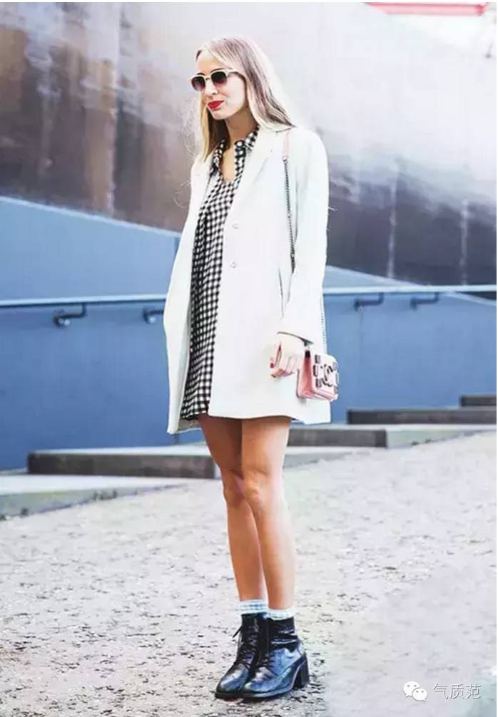 适合还不是很冷的天穿,这种搭法很奇妙,性感和酷感并存。不过记得要把袜子的边缘露出来哦~