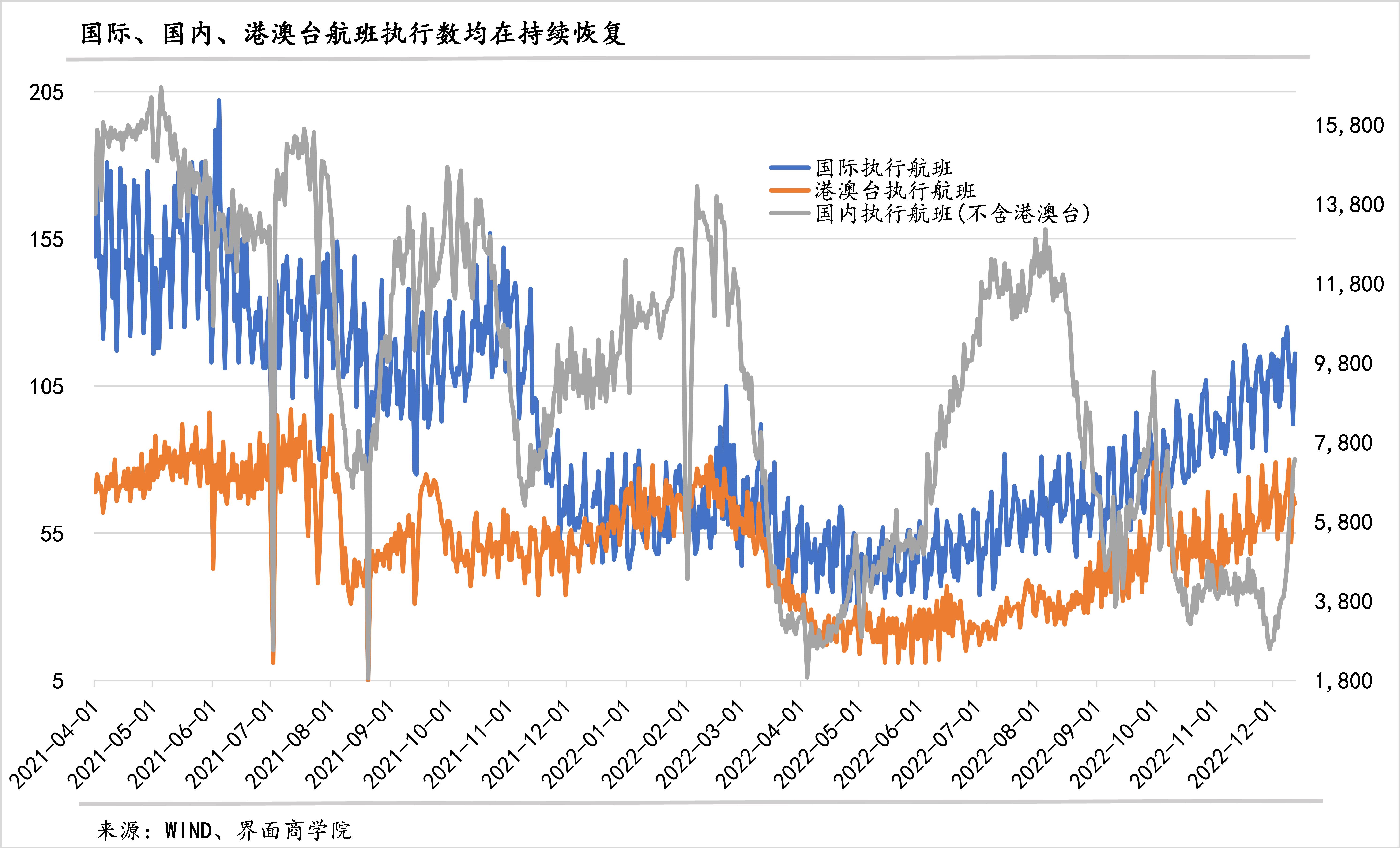 1、人员的跨区域流动持续恢复:无论是国际航班、港澳台航班,还是不含港澳台的国内航班,均已先后进入恢复通道,特别是国内航班12月以来快速恢复。