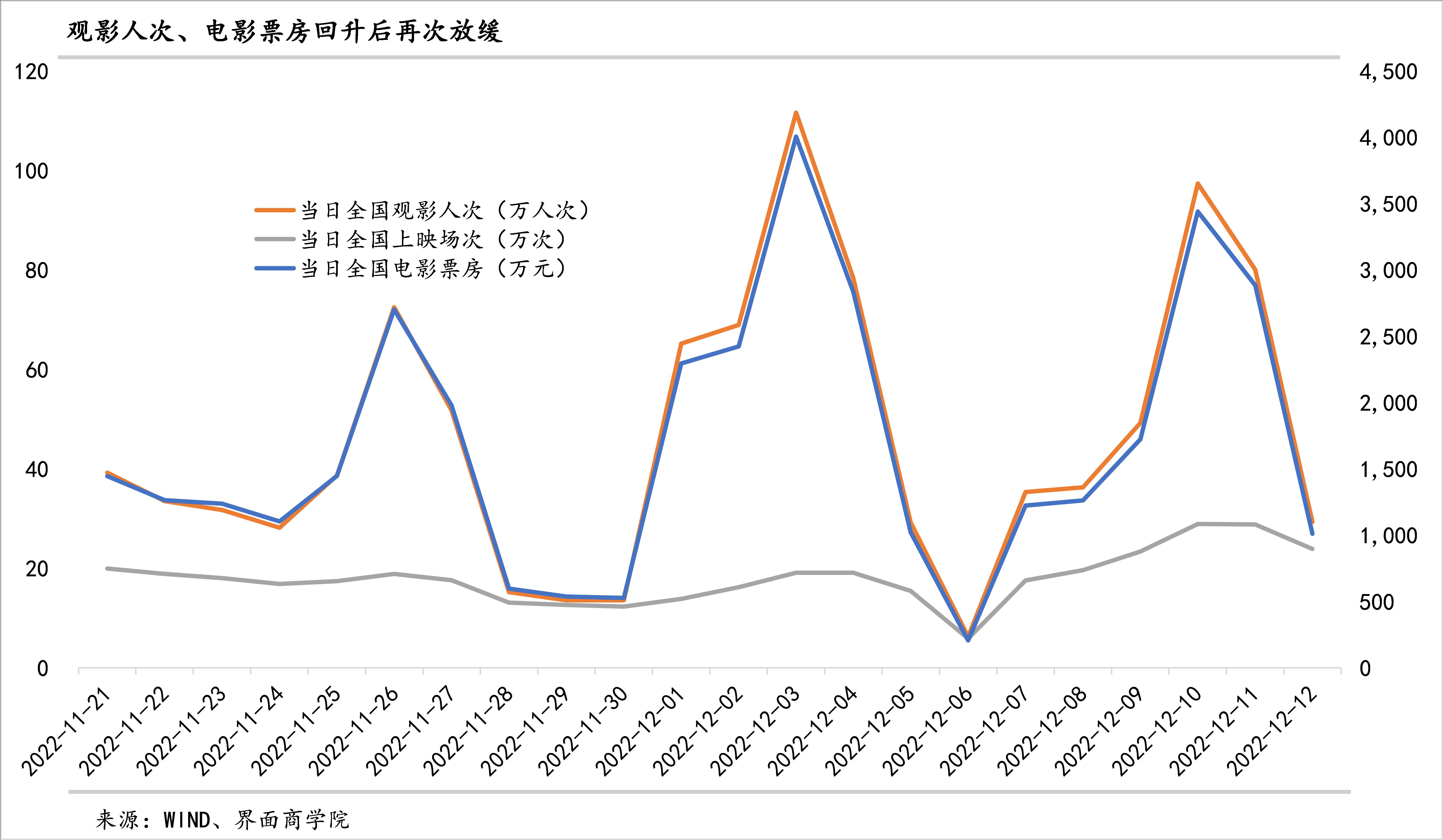 3、观影人次出现反复:与11月下旬的低位相比,电影市场可能已经见底回升。不过,回升势头也有反复。