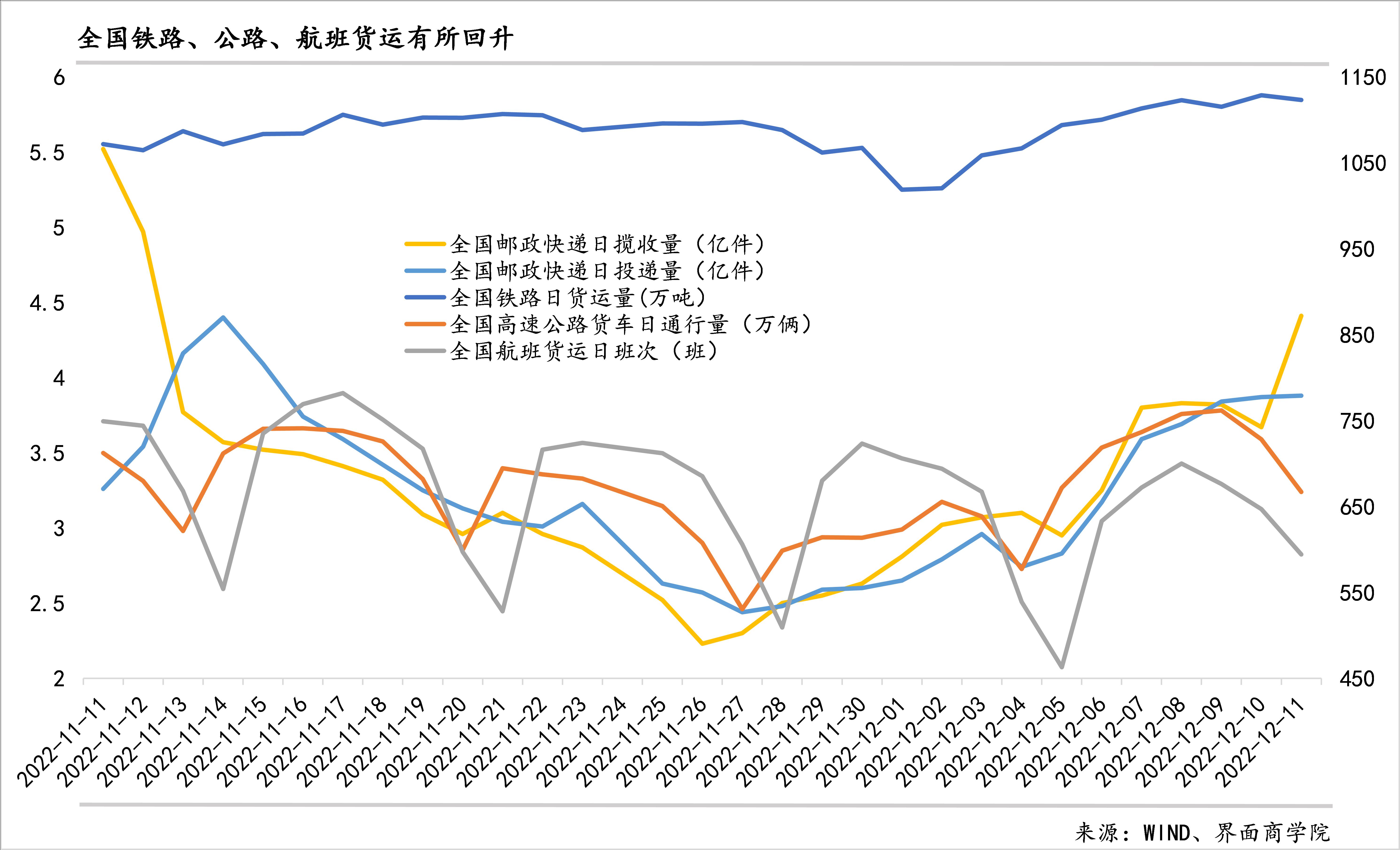 12月12、13日(本周一、周二),全国货运快递较上周同期有明显改善。全国铁路货运量较上周增长1.2%;全国航班日班次较上周一增长10.6%,其中,国际班次下降4.0%,国内班次上升61.7%;全国邮政快递日揽收量上升43.4%、日投递量上升34.5%;全国高速公路日通行货车上升10.3%。