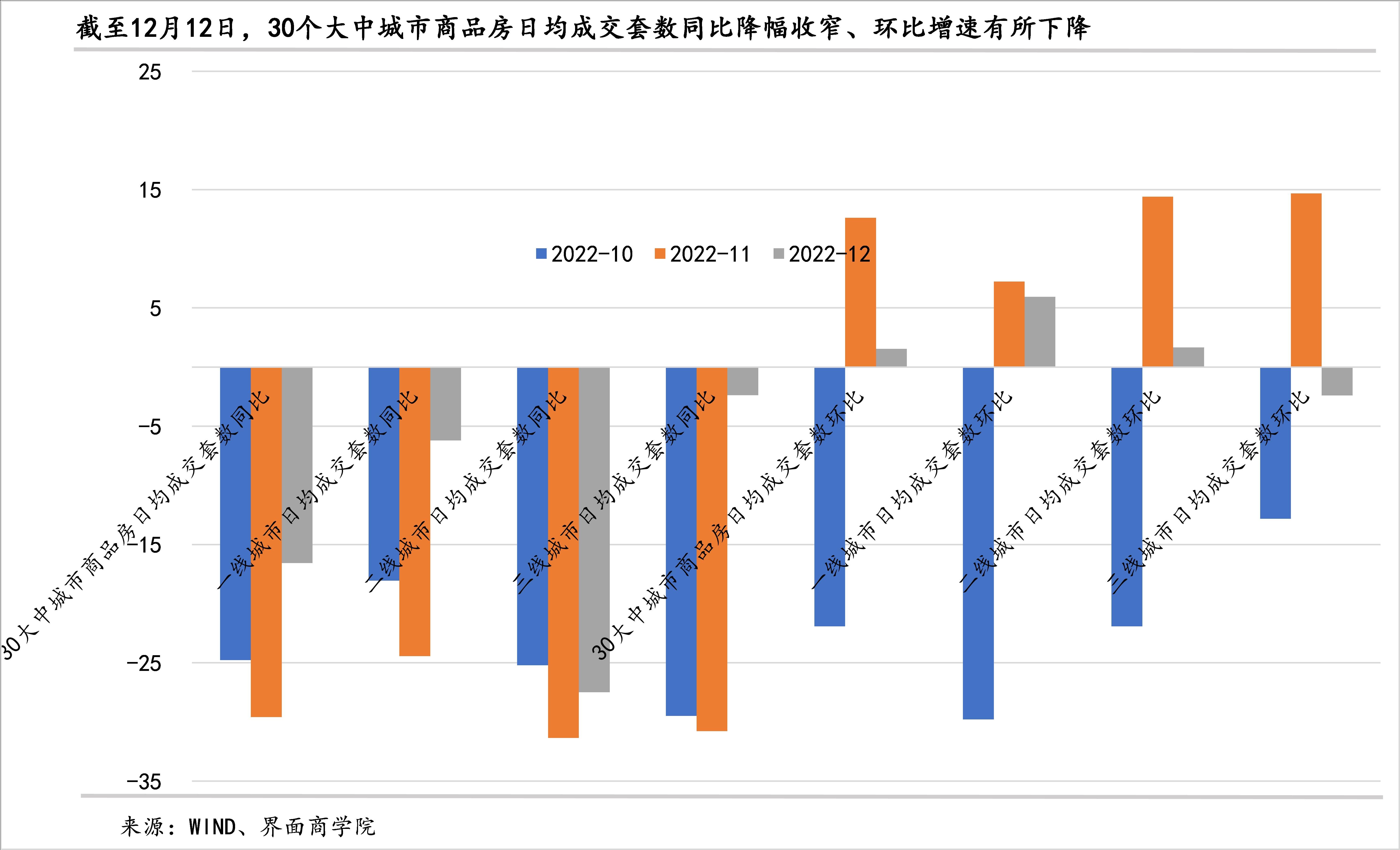 从月度日均成交量来看,截至12月12日,30个大中城市成交套数同比降幅较11月收窄,环比仍保持正增长、但增速下降。