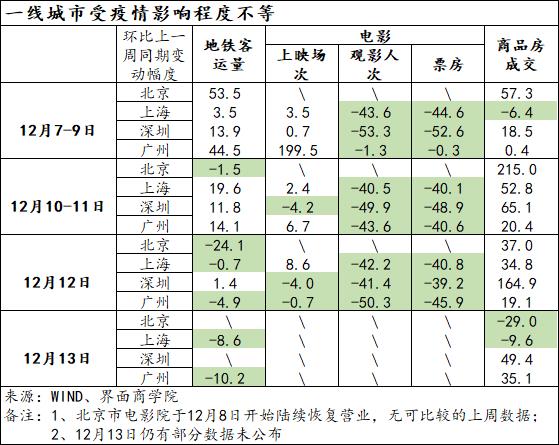 综上,人与物的流动、商品房成交、电影市场总体上都较11月低位有明显回升,但随着疫情的扩散,货物流动受到的影响相对较小,与人自身活动关系紧密的指标则陆续回调。这一现象我们也可以从四个一线城市“新十条”实行以来的表现得到印证。