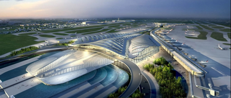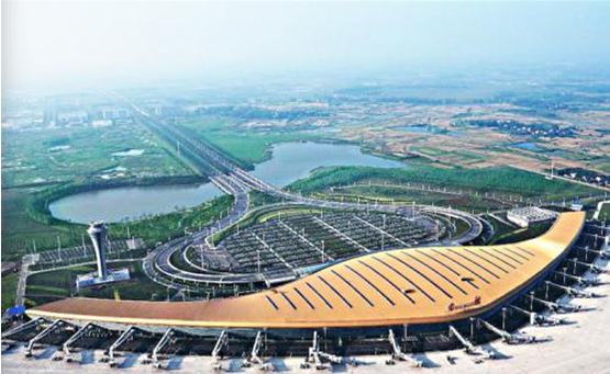 合肥新桥机场在2013年5月30日正式启用,屋面采用金黄色的直立锁边铝镁锰合金面板,规律设置19排屋面采光天窗。俯视整个建筑,宛若金色的展翅大鹏在江淮分水岭上昂首欲飞,既是一张代表合肥形象的新“名片”,也是安徽又一标志性新景观。该机场分布式光伏发电项目贯彻节能减排理念,在优化能源系统运行效率的同时,有效推动了合肥市“中国光伏应用第一城”的构建,促进我国“绿色机场”的可持续发展。