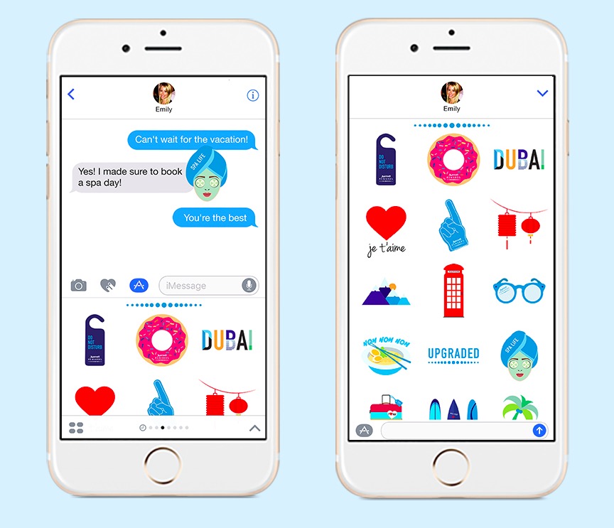 万豪国际集团则推出了一款旅行为主题的表情包,在椰树、拉面、酒店门牌等旅行元素的贴图中间,悄悄地把万豪的logo也放了进去。