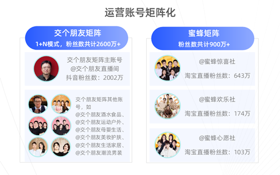 多渠道发展和矩阵式布局一起,成为了直播机构提高经营稳定性的重要手段。交个朋友、东方甄选等都是从直播矩阵中走出来的佼佼者。