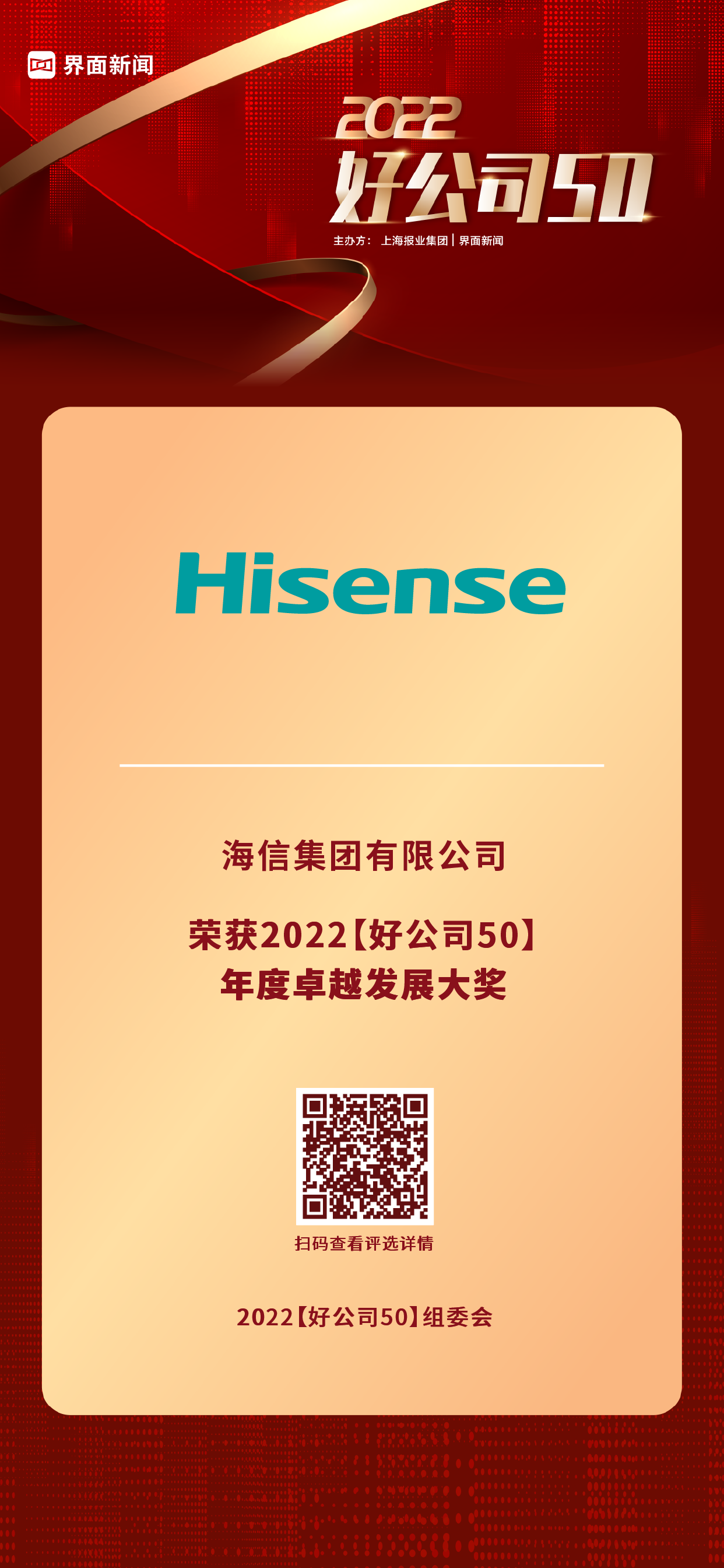12月20日,上海报业集团|界面新闻在上海中心举办了【2022好公司50】颁奖典礼,正式公布了本年度的获奖名单。评选自今年7月正式启动申报以来,来自39个细分行业的500余家候选公司,经过近半年的大众投票、市场表现、创新活力、公司治理、社会声誉等方面的角逐,最终50家优质企业突破重围荣登年度荣誉榜单。海信集团有限公司致力于科技创新引领以智能化为核心的先进制造,荣膺【2022好公司50——卓越发展大奖】。