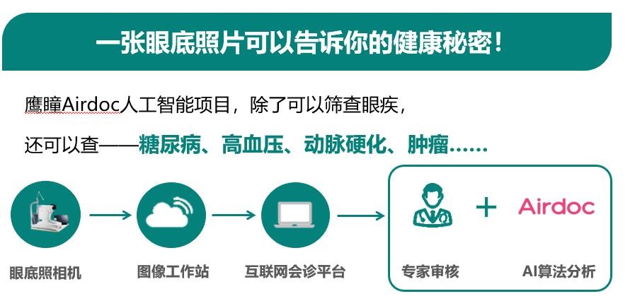 疾病“早筛查、早诊断”的实现有赖于医疗科技的不断进步。爱康集团引进的鹰瞳Airdoc人工智能项目,除了可以筛查眼疾病,还可以筛查糖尿病、高血压、动脉硬化、肿瘤等慢性疾病导致的眼底疾病和异常。在近四年中,作为咨询服务项目,在爱康已经有超过300万用户选用了这项技术服务。鹰瞳Airdoc人工智能视网膜影像评估通过拍摄视网膜影像,应用人工智能技术,可快速筛查出10大类35项病变,起到早发现、早诊断、早治疗的作用。