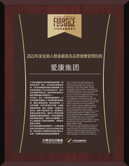 在此次亚洲金融年会上,2022年度21世纪金融竞争力研究案例正式揭晓,通过公开透明的客观数据,对亚洲范围内金融机构进行全面梳理及研究,挖掘出年度优秀样本案例,以表彰卓越的金融机构及领军人物,旨在为亚洲金融展示标杆力量,推动行业的健康发展。爱康集团凭借对金融高净值人群的优质服务,荣获“2022年度金融人群卓越服务品质健康管理机构”奖项。