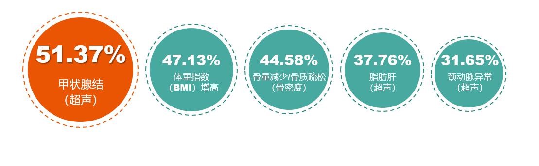 根据2022年金融高净值客户体检套餐的组成和参与体检项目的到检率,选择了23项体检异常结果进行统计发现(排除与性别相关的前列腺异常、乳腺结节等体检异常结果):甲状腺结节在中国金融高净值客户中的检出率最高,达到51.37%,往下依次为体重指数(BMI)增高、骨量减少/骨质疏松(骨密度)、脂肪肝(超声)、颈动脉异常(超声),检出率均超过三成。这与爱康集团刚刚发布的《2022年中国企业健康绿皮书》中企业家的主要健康问题基本一致。其中,甲状腺结节检出率均超五成,由此可见,精英人士的甲状腺问题的确令人担忧。究其原因,应该与其工作节奏快,工作强度大有关。另外,饮食与生活习惯的改变,生活环境中内分泌干扰因素的增多,也都令甲状腺问题愈加高发。