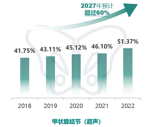 在不考虑人口年龄结构、国家卫生政策及其他影响因素变动的情况下,根据2018年-2022年在爱康集团体检的中国金融高净值客户体检数据开展分析预测发现,截至2027年底,国内金融高净值客户的甲状腺结节(超声)检出率预计有可能超过60%,需要特别关注。