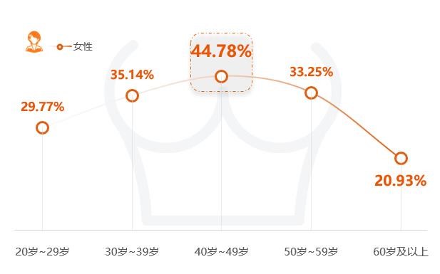对女性金融高净值客户而言,除甲状腺结节外,乳腺结节同样需要引起重视。2022年中国金融高净值客户乳腺结节(超声)检出率的性别年龄分布统计数据显示:女性金融高净值客户乳腺结节(超声)的检出率随着年龄的增长呈现先升高后降低的趋势,40岁-49岁女性金融高净值客户乳腺结节(超声)检出率超过40%。