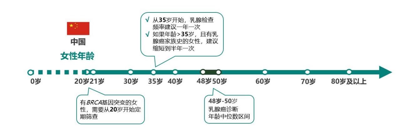 定期进行健康体检是早期发现乳腺疾病的重要措施。爱康建议:中国女性应从35岁开始,乳腺检查频率建议1年1次;如果年龄>35岁,且有乳腺癌家族史的女性,建议缩短到半年一次;如有BRCA基因突变的女性,需要从20岁开始定期筛查。在触诊的基础上,选择超声检查、乳腺X线钼靶检查、乳腺磁共振MRI检查、肿瘤标志物等有针对性的检查。
