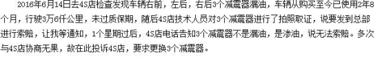 该车主投诉称,他的2013款森林人汽车,在2016年6月检查车辆的时候,发现车辆三个减震器都有漏油现象,4S店拍照取证后,告诉车主这不是漏油,是渗油,无法索赔。