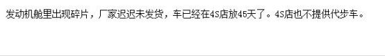该车主投诉称,他的2012款斯巴鲁森林人发动机发动机舱里出现碎片,厂家迟迟没有发货维修,导致车辆已经在4S店长期存放,也不提供代步车,严重影响车主的生活。