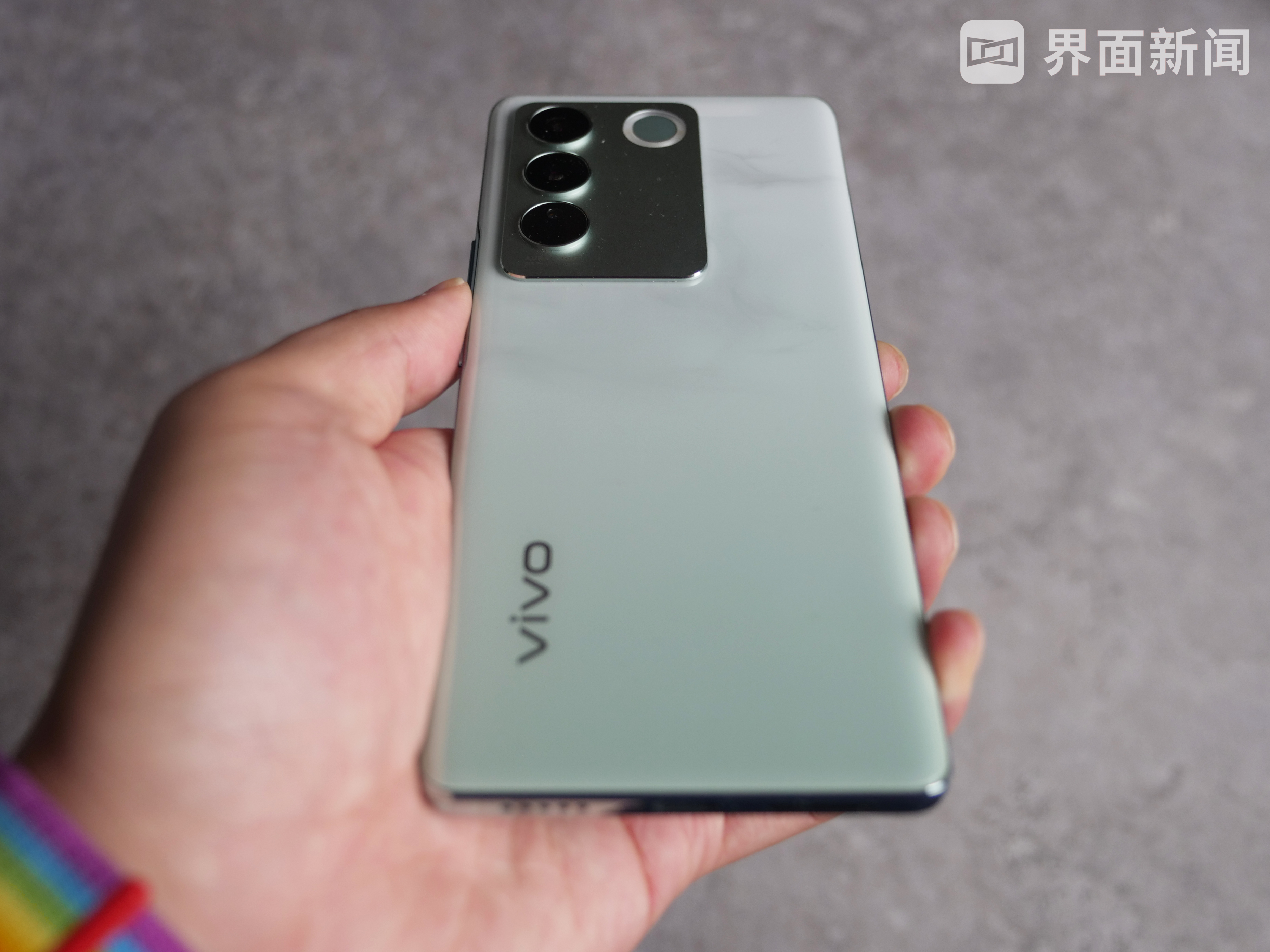 细看之下,新机“颜如玉”的配色接近青绿,自下而上由淡绿慢慢散开为雅白,vivo的logo则被放置在新机的左下侧。