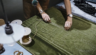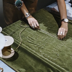 进门后等着你的是Thomas’s Café,它和Burberry里根街旗舰店里的咖啡馆一脉相承。当参观者习惯室内光线后,向右就会看见手工艺者,他们一边做流苏、编织马毛、拼接刺绣、装订图书,一边向访客轻声讲解。最深处的一面墙上贴满本季设计参考,有些是手绘稿,有些是历史文献,还用钉子固定着各种面料,其中包括在上一季大出风头的包袋Patchwork。不过,最突兀的或许是长篇小说《奥兰多》——本季时装灵感便来源于此。它的作者是英国意识流代表弗吉尼亚·伍尔芙,小说中记录了主人公奥兰多从16世纪贵族少年转变为20世纪女性之身,跨越300多年的故事。