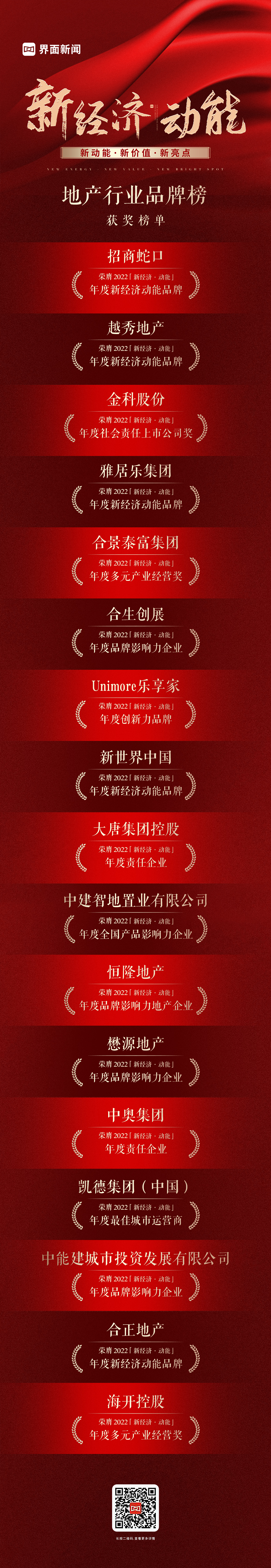 2022【新经济·动能】地产行业品牌榜,采取由机构及行业专家推荐首轮入围,通过网络投票、模型评价、专家评审等环节,遵循独立、客观、科学的原则,以确保评选公正性与社会价值。并围绕企业市场表现、创新活力、公司治理、社会声誉等四个维度,评选出2022年度具有领先核心竞争力,年度表现卓越的企业。通过界面新闻在财经媒体领域的领先影响力与全媒体矩阵,多角度、全渠道、高质量报道企业的核心价值与创新活力。