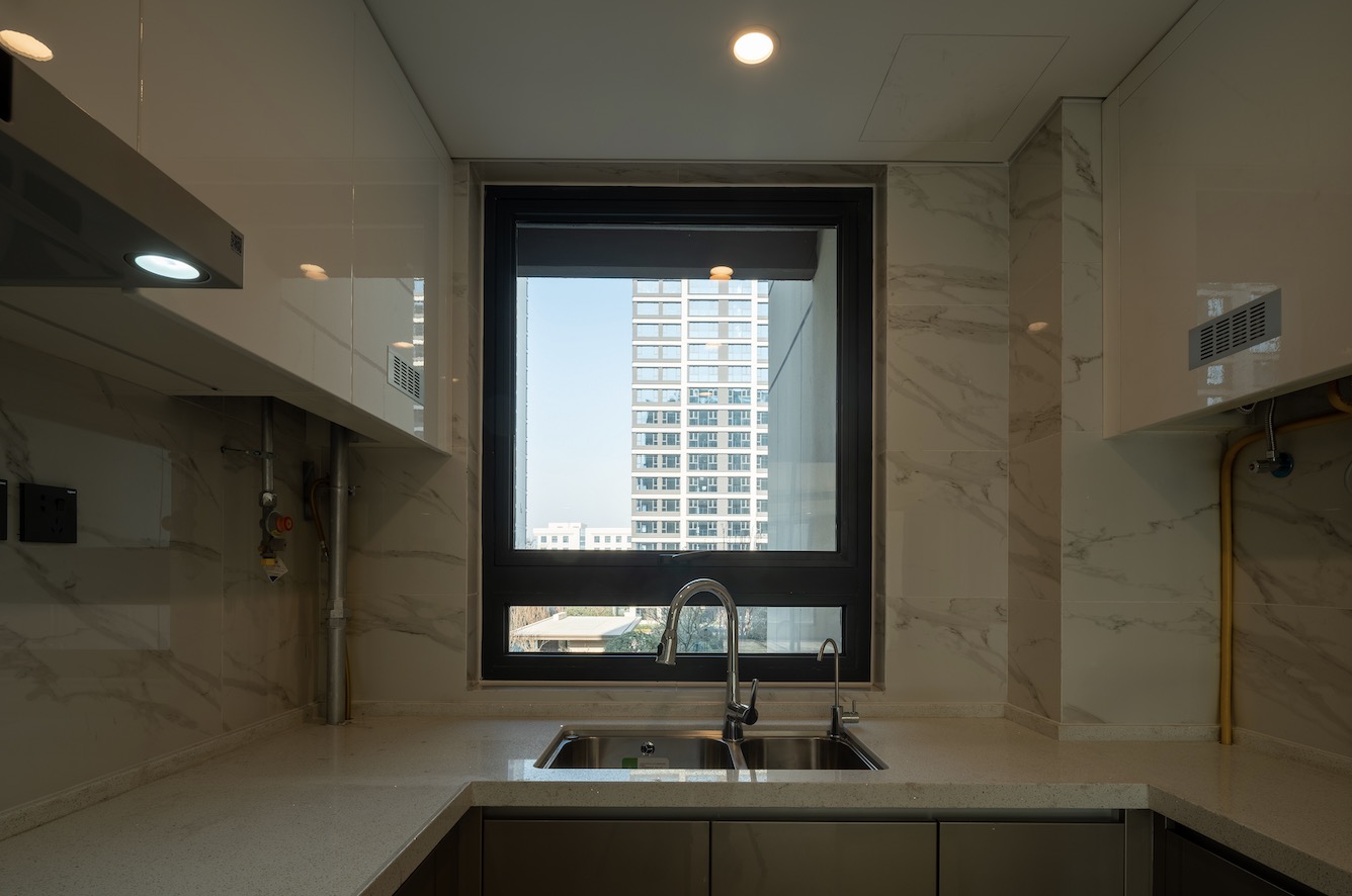 入户门选用了钢木质防盗门,入门第一眼便是玄关系统的呈现,整墙式的储物柜采用上中下结构设计,中区开放储物,在充分利用空间的同时,更好的满足业主生活所需。满屋壁纸都做到平整无凹凸点,壁纸接缝自然无痕迹,与门套、柜体、窗扇等交接处无缝隙,接缝顺直。考虑到夏天做饭时的酷暑难耐,在厨房顶部安装了凉霸,凉风轻拂下,业主可以潇洒的和汗流浃背的烹饪方式说拜拜了。