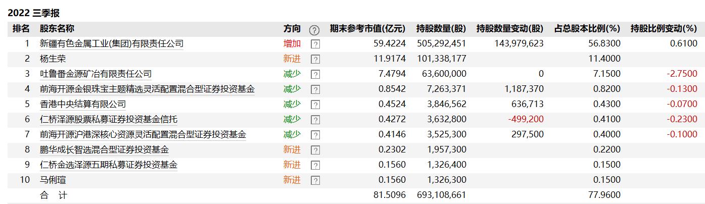 从公司前十大股东来看,截至今年三季度末,控股股东新疆有色金属工业(集团)有限责任公司持股比例为56.83%,副董事长杨生荣持股比例11.40%,为第二大股东。