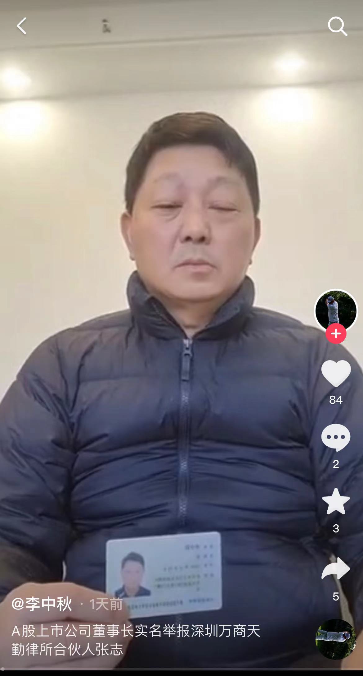 1月3日,A股上市公司深华发A(000020.SZ)董事长李中秋在抖音发布视频实名举报万商天勤律师事务所合伙人张志,引发业界关注。
