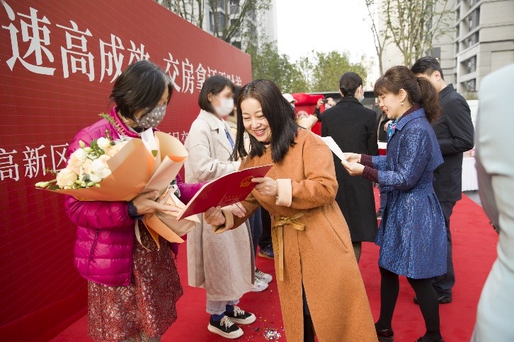 “交付交双证”、“交付领钥匙”、“交付即入住”、 “交付即开业”,从商业配套、建筑美学、匠心品质等不同维度,翡翠国宾实现从“交房子”到“交生活”的改变,兑现了业主承诺,也为3033户业主呈上完美答卷。