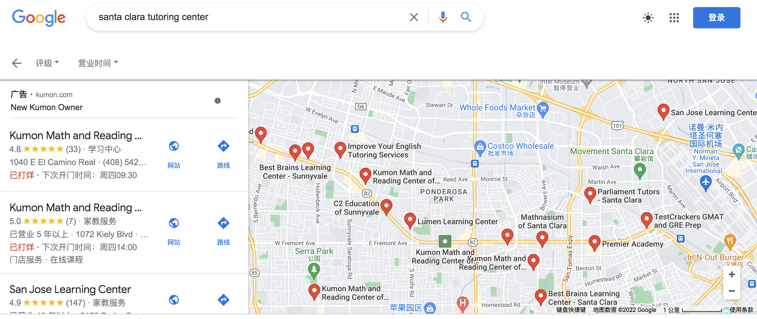 界面教育在Google Map上以Santa Clara tutoring center为关键词搜索发现,数学和语言培训机构密集分布在Palo Alto地区的EL Camino Real,包括来自日本的数学与阅读补习班Kumon公文式教育、美国本土的连锁数学培训机构mathnasium,俄罗斯数学(The Russian School of Mathematics)补习班以及标化考试补习机构Insight Education等。