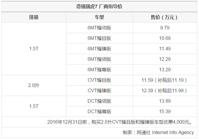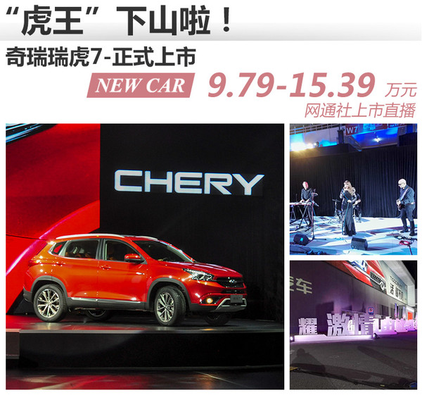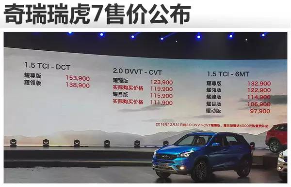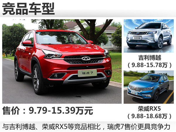 奇瑞现有产品阵容中,已包含瑞虎3、瑞虎5两款SUV。在此基础上,更大尺寸的全新产品瑞虎7于9月20日正式投入市场。网通社从奇瑞官方获悉,奇瑞瑞虎7共推出6款车型,售价区间为9.79-15.39万元。动力方面提供2.0升自然吸气和1.5T涡轮增压发动机可选,传动系统匹配MT、CVT以及DCT变速箱。