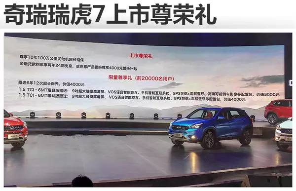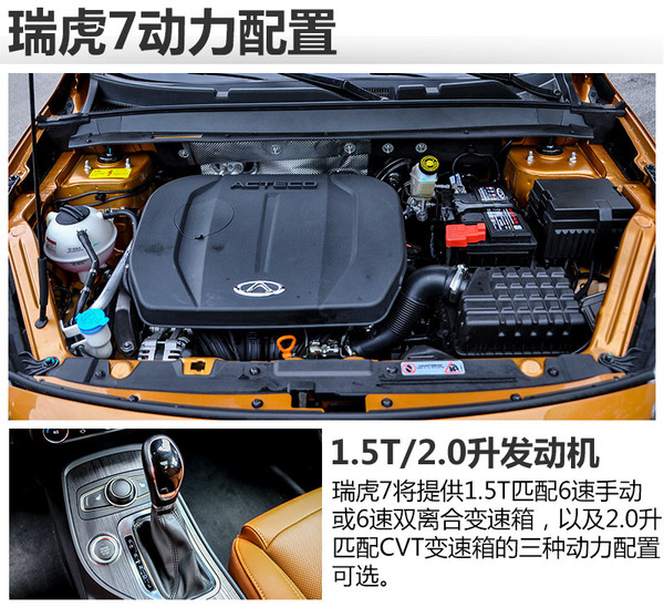 动力方面,瑞虎7将提供1.5T涡轮增压以及2.0升自然吸气两种动力配置可选。传动系统方面,1.5T发动机提供匹配6速手动变速箱、6速双离合变速箱的车型;而2.0升发动机则将匹配CVT变速箱。