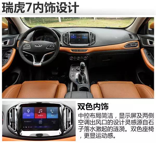 内饰方面,瑞虎7的设计感也延续了其水流动感设计理念,中控布局简洁,中控显示屏及两侧空调出风口的设计灵感源自石子落水激起的涟漪。黑棕拼色内饰,也使得内饰看起来更加动感,更加年轻化。