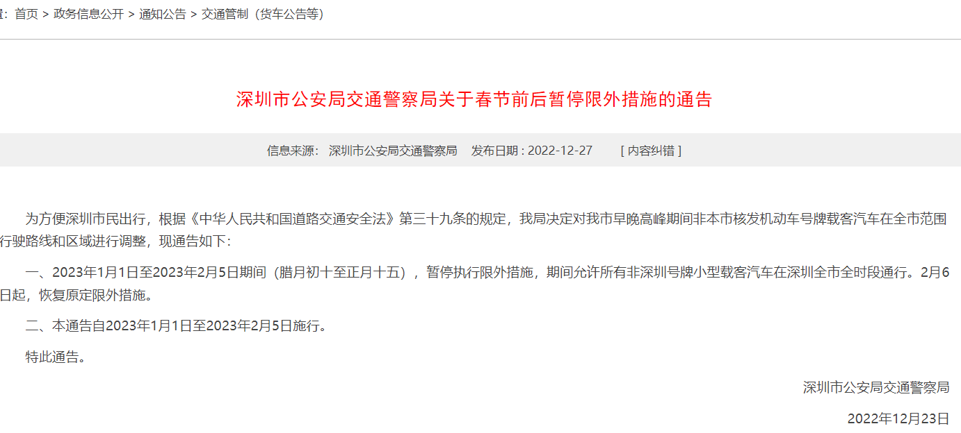 一、2023年1月1日至2023年2月5日期间(腊月初十至正月十五),暂停执行限外措施,期间允许所有非深圳号牌小型载客汽车在深圳全市全时段通行。2月6日起,恢复原定限外措施。