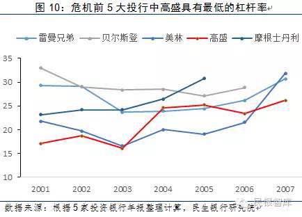 主动去杠杆。为满足巴塞尔协议III等外部监管的要求,控制经营风险,以美国投行为代表的金融机构都纷纷加速去杠杆,境外投行的经营杠杆都从危机前约30倍的水平下降至2015年约10倍左右的水平,其中高盛的杠杆比例从2007年高峰时期的26.2倍下降至2015年约10.3倍的水平。