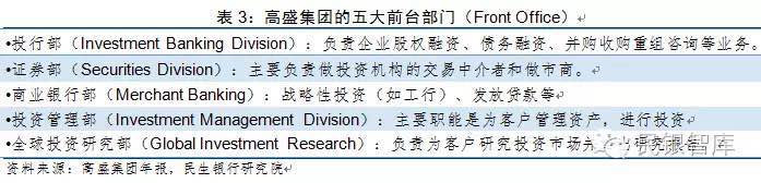 在高盛内部,五大前台部门分别是投行部、证券部、商业银行部、投资管理部、全球投资研究部,这些部门共同组成了服务客户的四大业务条线。
