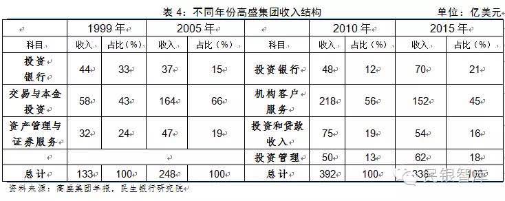 后危机时期,国外投行纷纷借助多元化发展来提升抗周期能力,应对盈利下滑的压力。很多金融机构改变了商业模式,部分机构开始从事零售业务或者从国际扩张转向国内市场。但是高盛并没有改变核心战略,其仍然专注于投资银行业务,仍主张全球化运营。
