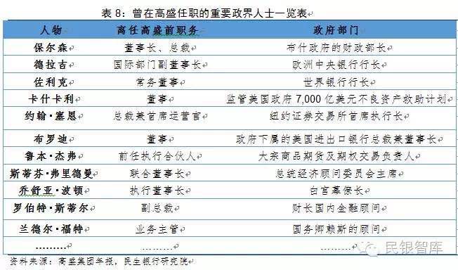 在欧美政界,高盛具有广泛而深厚的人脉,这其中的典型事实是大量高盛前雇员都在政府重要职位任职,这为其业务拓展和日常运营提供了良好便利。这从深层次证明高盛非常注重政府这个重要客户群体的经营。