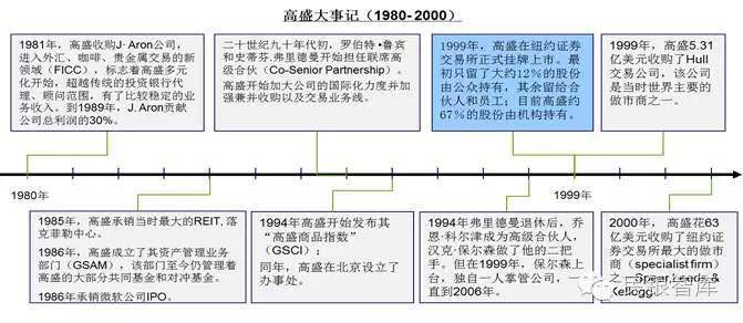 到20世纪90年代,在鲁宾和弗里德曼、科尔津和保尔森等卓越领导人相继带领下,高盛逐渐成为享誉全球并持续保持领先地位的金融企业。在成长为顶尖投行的过程中,高盛业务经营的一个显著特点是逐渐突破传统投行的业务边界,开启多元化发展,其标志性事件是1981年通过收购J·阿朗公司进入大宗商品交易领域,该项收购使交易业务对高盛营收和利润的贡献持续达30%以上;20世纪90年代,高盛又开设资本投资业务,成立GS资本合作投资基金,引领了投行业直接投资业务的发展。