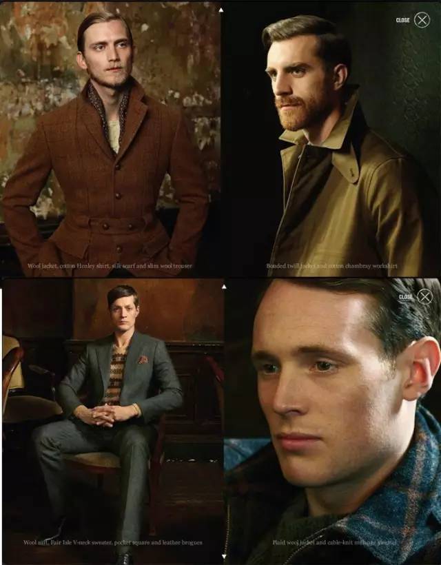 偏英式剪裁让整体风格偏传统,穿着像英伦范的绅士一般,产地多为英国或者意大利。客户主要为上流社会的中年男子,夹克外套在$1300-$9000间。