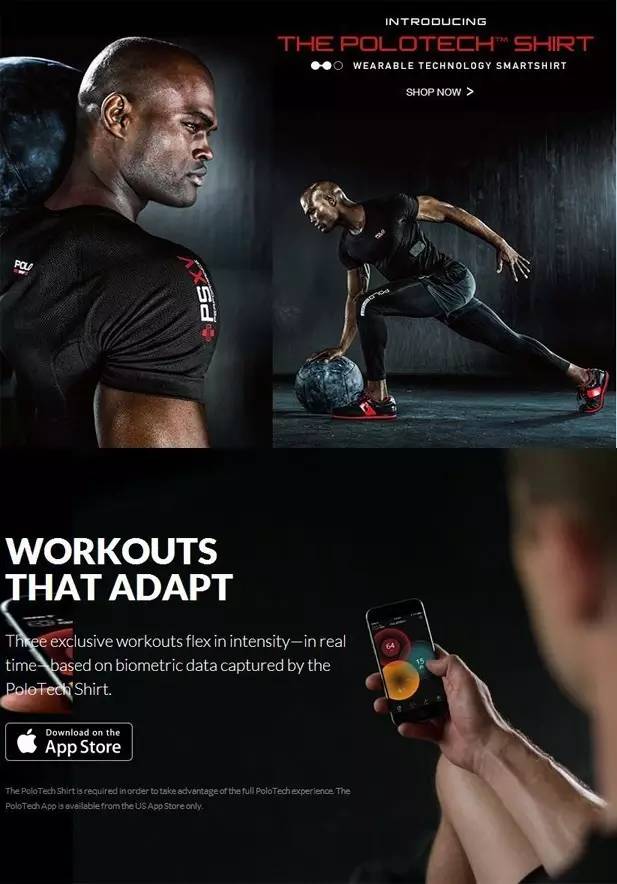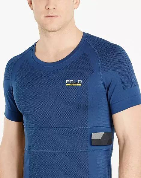 比如这个系列下的「PoloTech Shirt」智能 T 恤。它采用了 Ralph Lauren 的「Second-Skin」技术,通过将银质的感应纤维内置于 T 恤当中,以此得到穿戴者的心率、呼吸状况、运动速度、及能量消耗等数据,而这些数据可以传输到苹果设备里的 iOS App 当中去,用户可以在他的 iPhone 或是 iPad 上查看这段时间的运动状态。