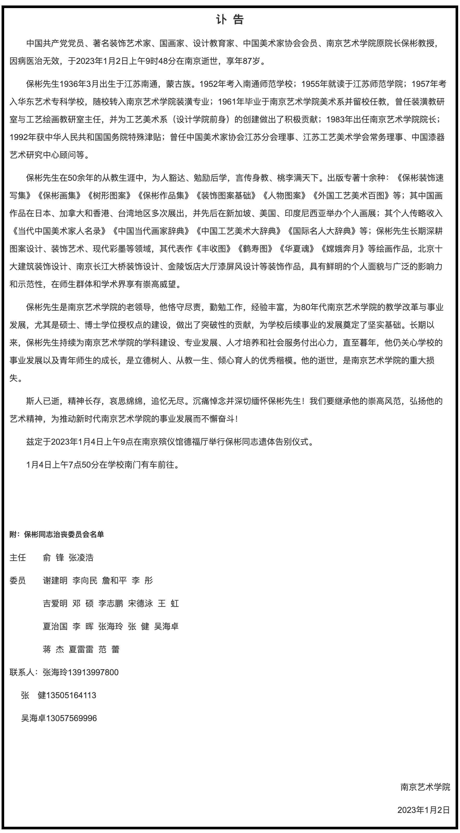 1月2日,南京艺术学院发布讣告,中国共产党党员、著名装饰艺术家、国画家、设计教育家、中国美术家协会会员、南京艺术学院原院长保彬教授,因病医治无效,于2023年1月2日上午9时48分在南京逝世,享年87岁。