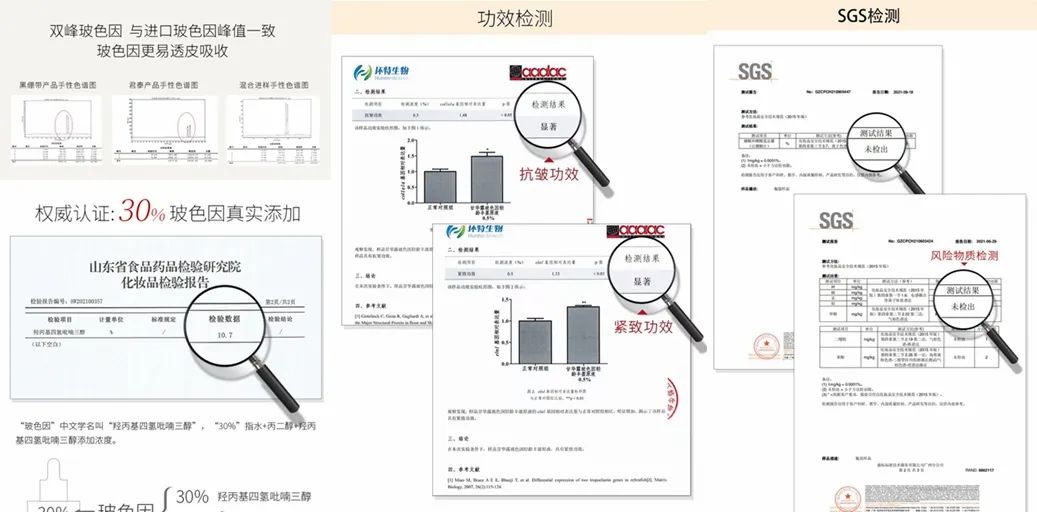 还有前面提及拥有“一种无色无味无硼酸盐的玻色因的生产方法”国家专利的山东君泰药业有限公司,其旗下的产品甘华露玻色因原液舒缓精华液,突破了玻色因提纯技术瓶颈,真正做到无色无味无硼酸的30%高纯度玻色因。经检测,产品双峰玻色因与进口玻色因峰值一致,还通过了SGS测试未检测出硼酸和硼酸盐产物以及风险物质,且在功效检测中证实产品具有显著紧致、抗皱功效。