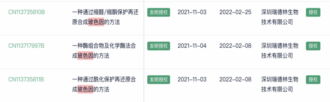 紧随其后的,是深圳瑞德林生物技术有限公司——一家以合成生物技术为核心,多学科交叉应用的创新型高新技术企业。其于2021年11月3日、4日一连提交了三项专利申请,分别为“一种通过酰化保护再还原合成玻色因的方法”“一种酶组合物及化学酶法合成玻色因的方法”“一种提高玻色因生物利用率的纳米乳制备方法”,三项专利于今年2月8日和25日分别被授权,这意味着我国企业在玻色因的绿色合成工艺上已实现崭新突破。